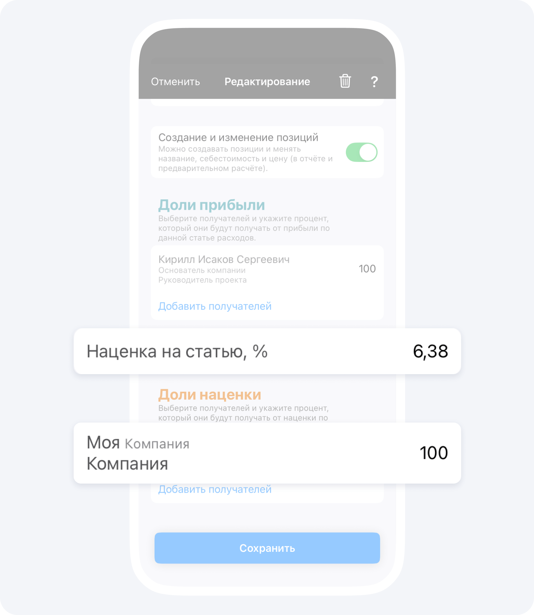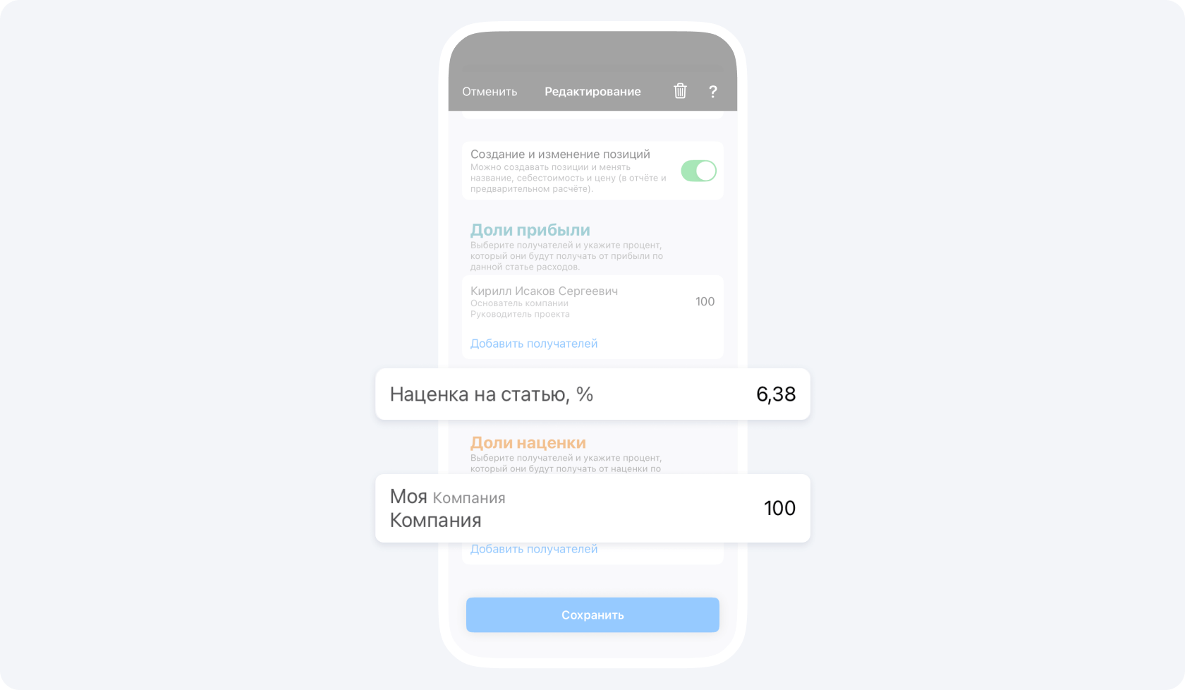 Приложение 101 позволяет делать это максимально удобно. Вы работаете в команде — у вас есть партнеры, прорабы — и каждый несет ответственность за жизнеспособность бизнеса, каждый заинтересован в процветании фирмы. Вы просто можете скинуться по 3-4% от своей прибыли на этот новый НДС и спать спокойно, не переживая об этих нововведениях больше. В Приложении 101 это можно сделать очень просто: увеличит процент, выделяемый на Фонд Компании — до этого он был, допустим, 10%, а будет 20%. Если у вас два прораба (руководителя проектов) и вы, то, скинувшись по 3% от прибыли, вы закроете эти новые траты.