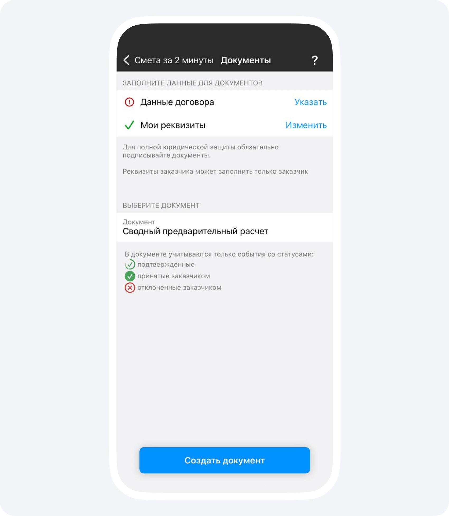 Вы получите документ, в котором будут собраны все подтвержденные вами расчеты. Его можно скачать в формате PDF и отправить заказчику для согласования.
