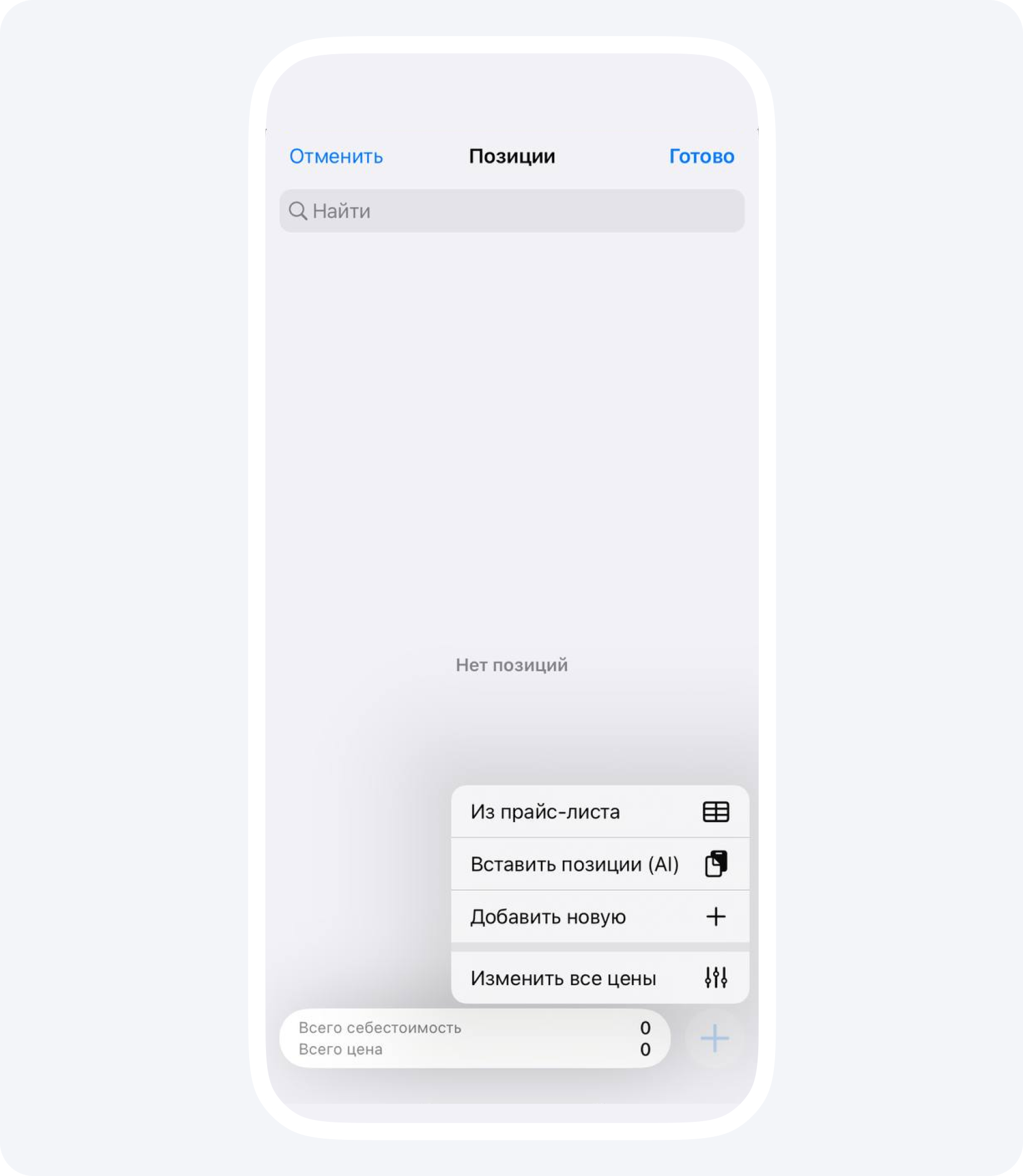 Для этого вам потребуется: создать событие Смета, выбрать проект (смета за 2 минуты), создать в нем статью расходов (она зависит от этапа работ) и с помощью AI вставить позиции из вашего прайс-листа.