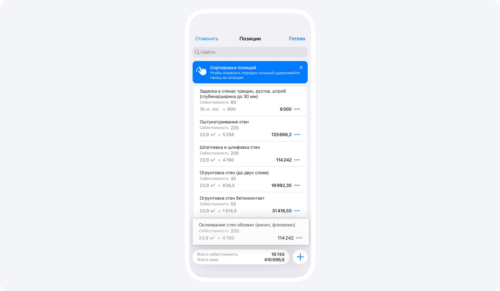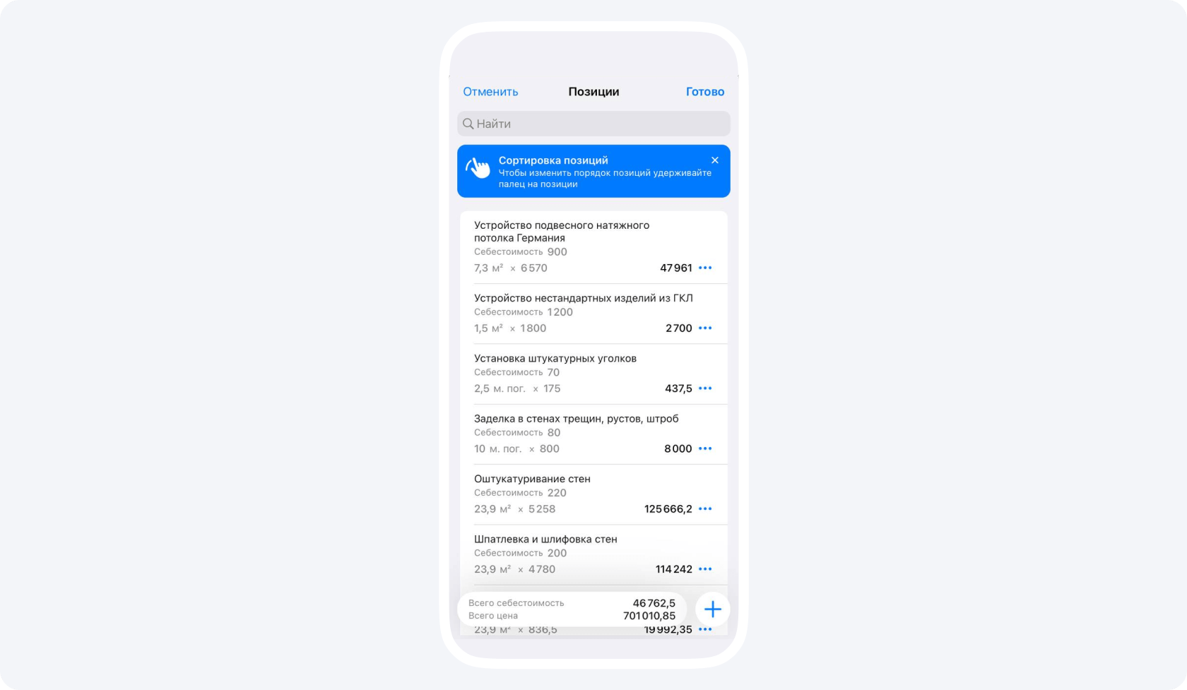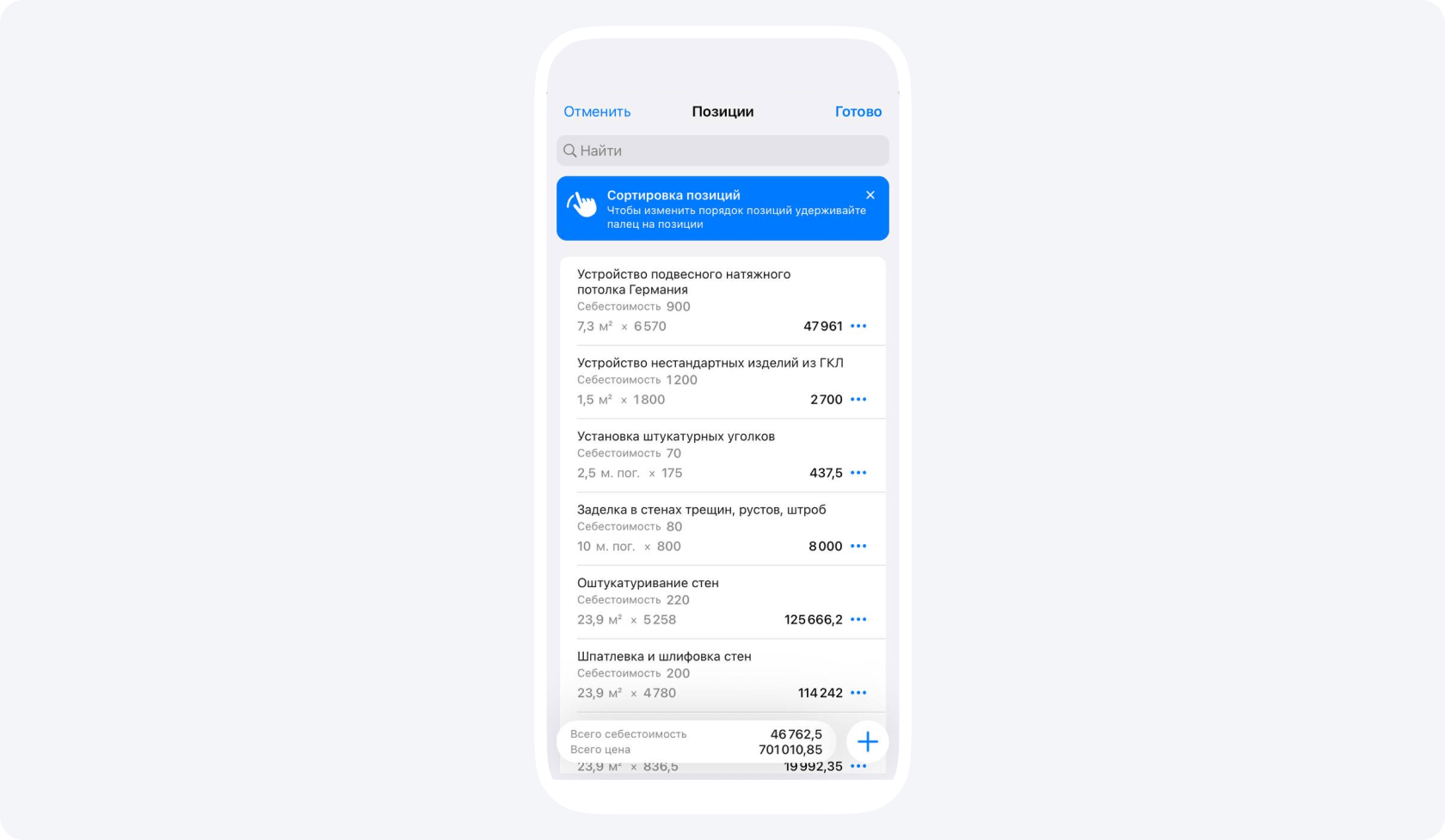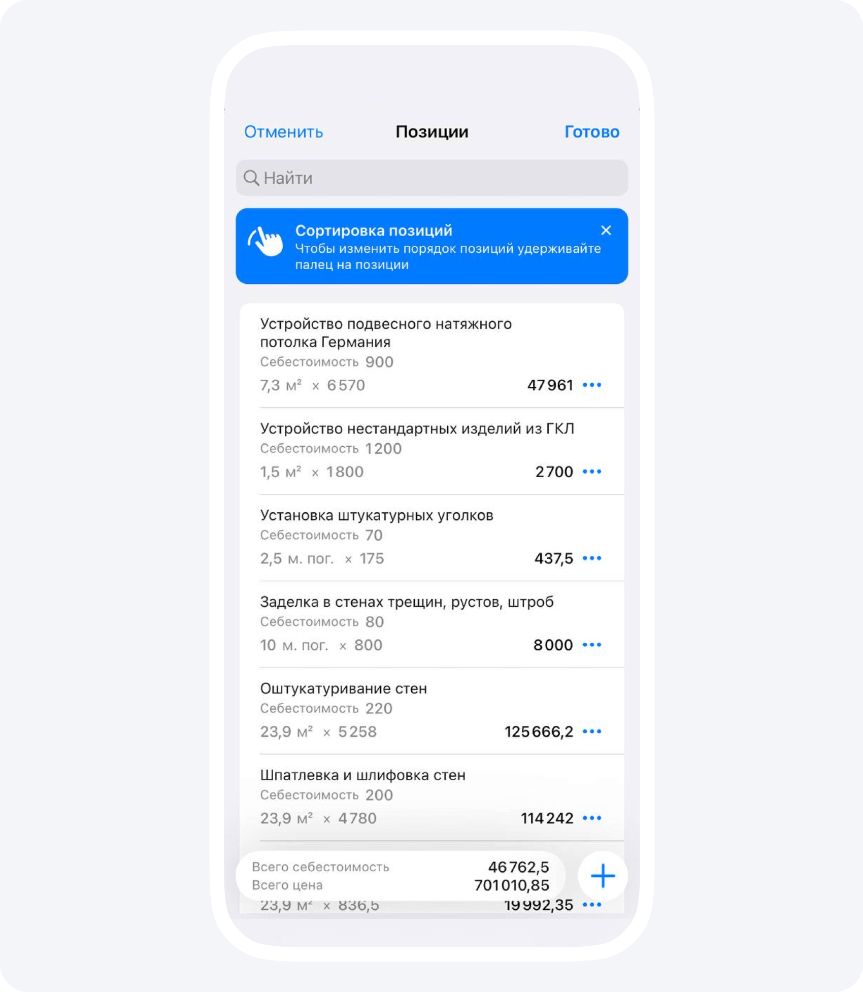 Мобильность. Прямо со смартфона вы можете редактировать позиции, менять стоимость и перемещать позиции внутри расчета.