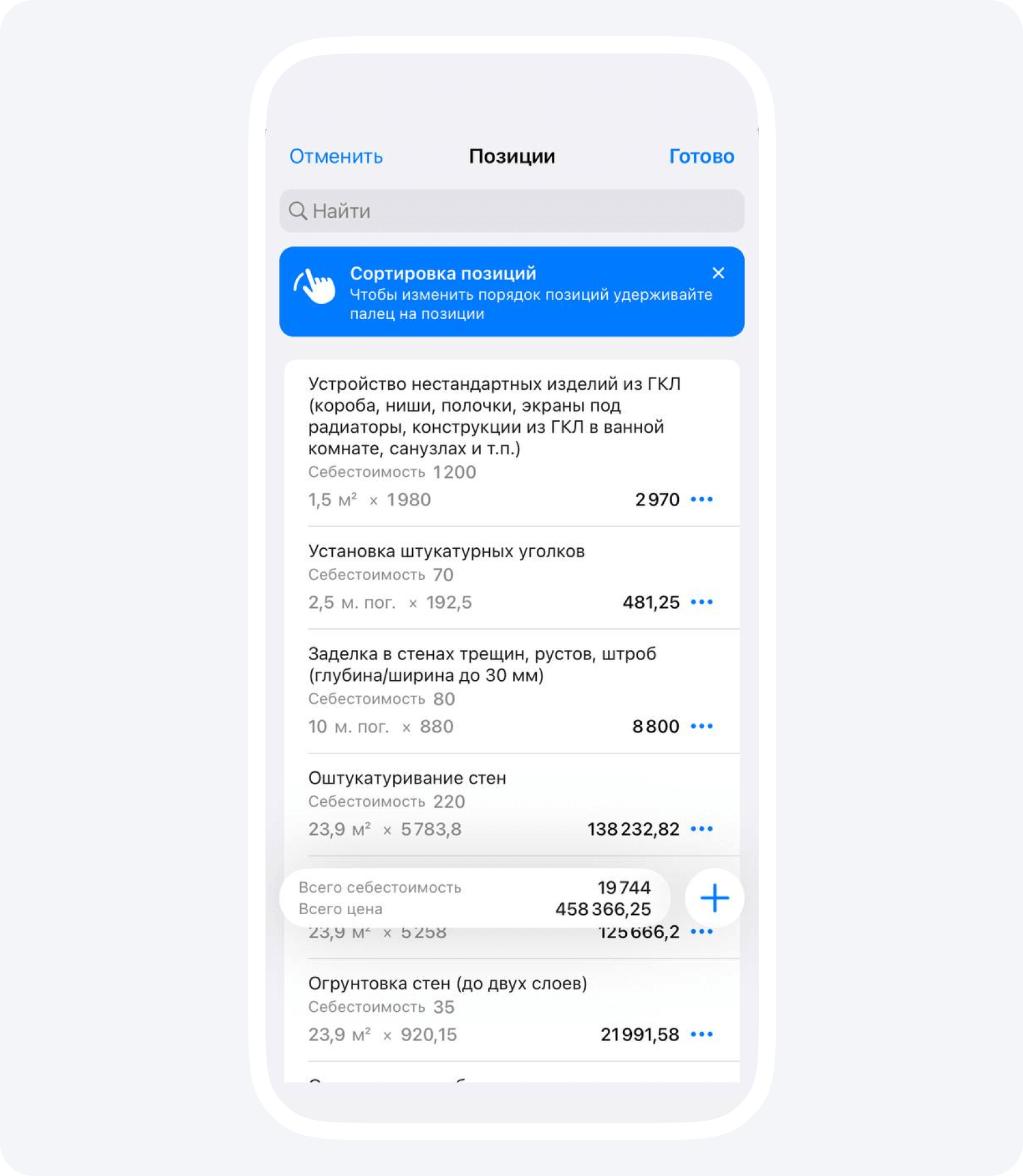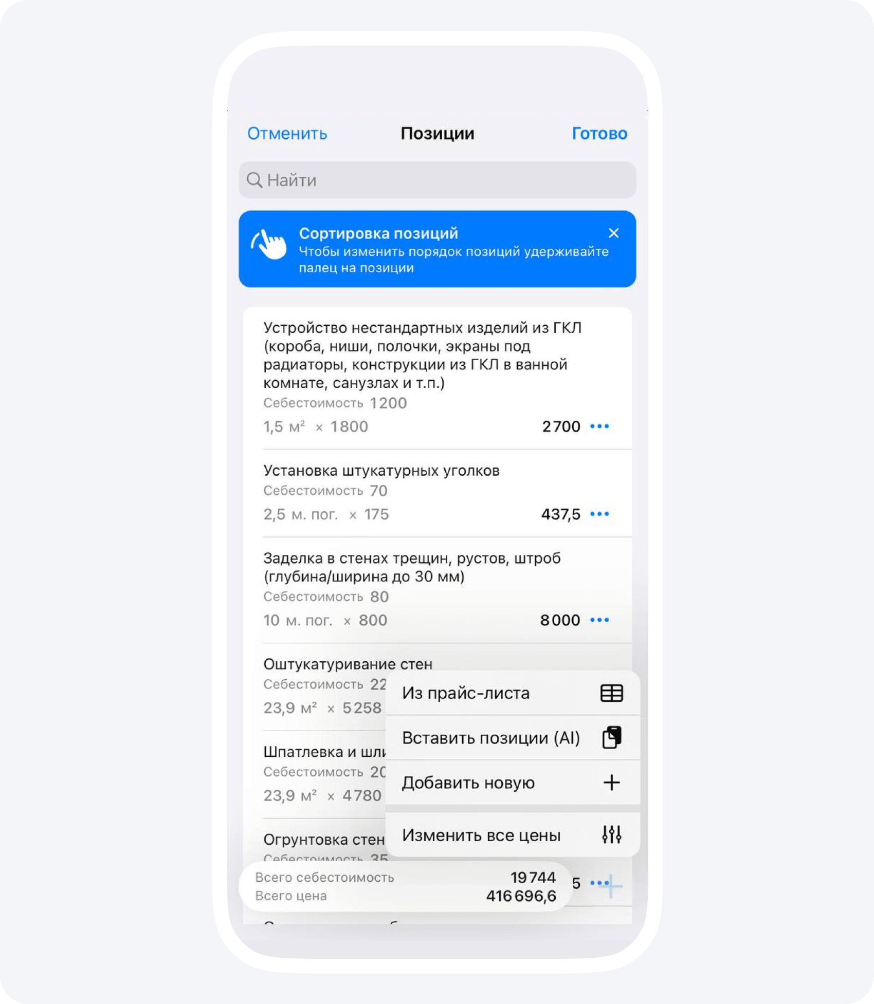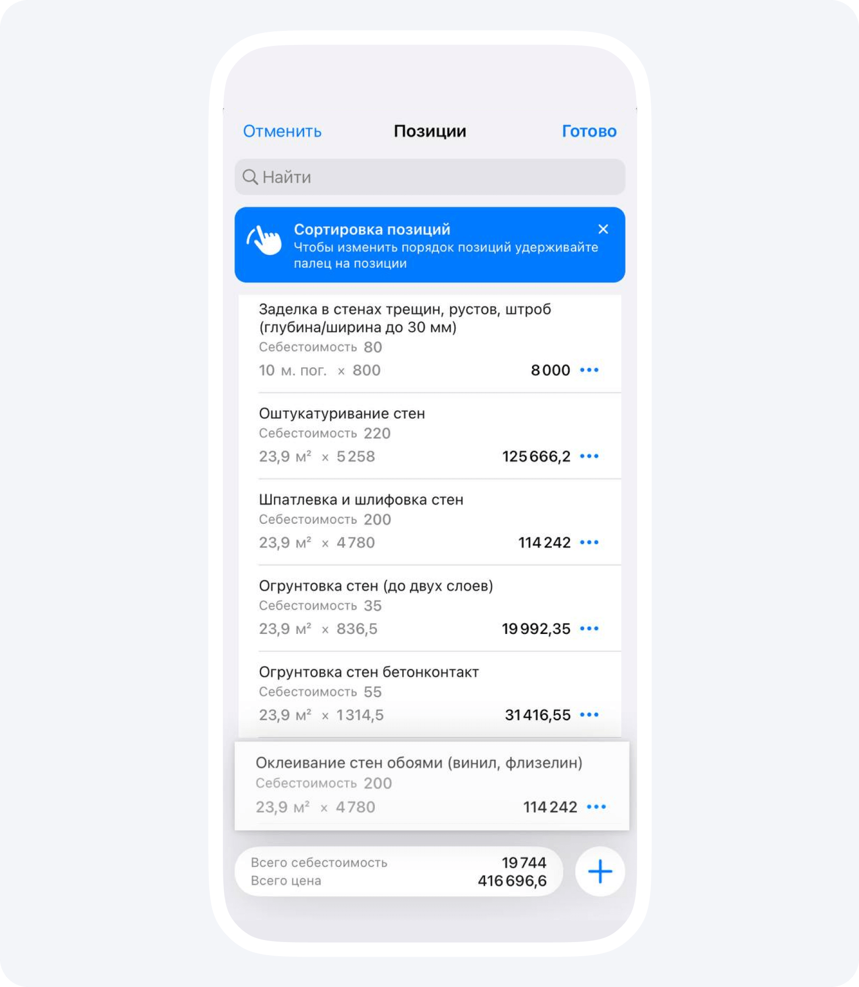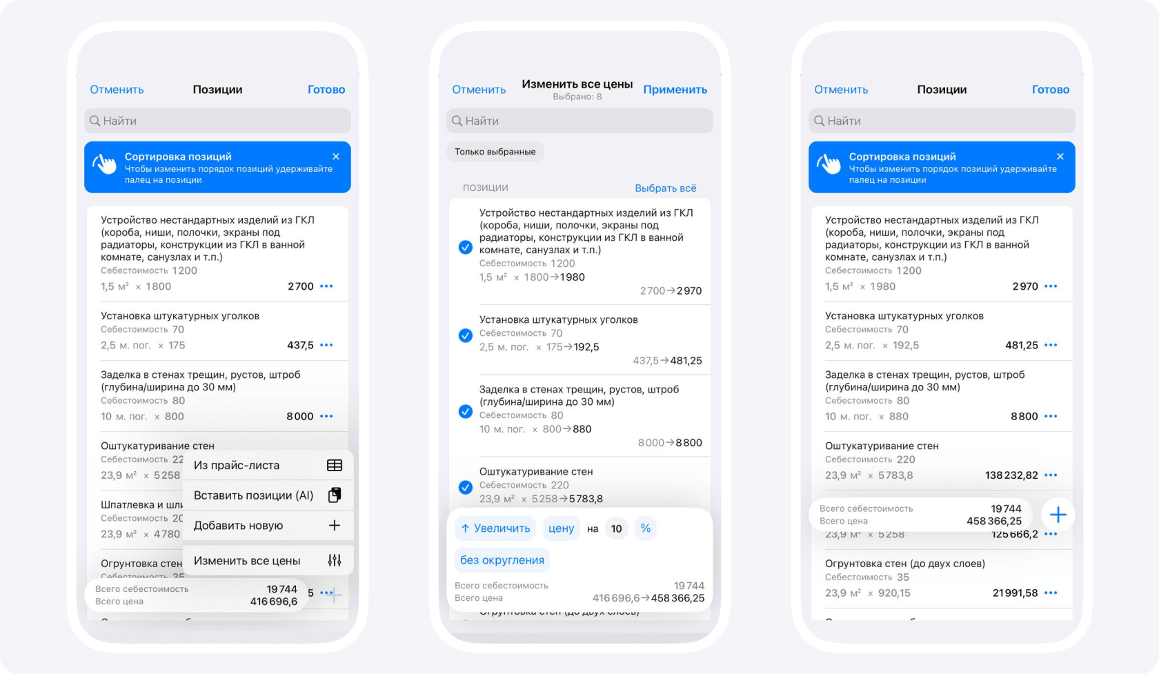 Мобильность. Прямо со смартфона вы можете редактировать позиции, менять стоимость и перемещать позиции внутри расчета.