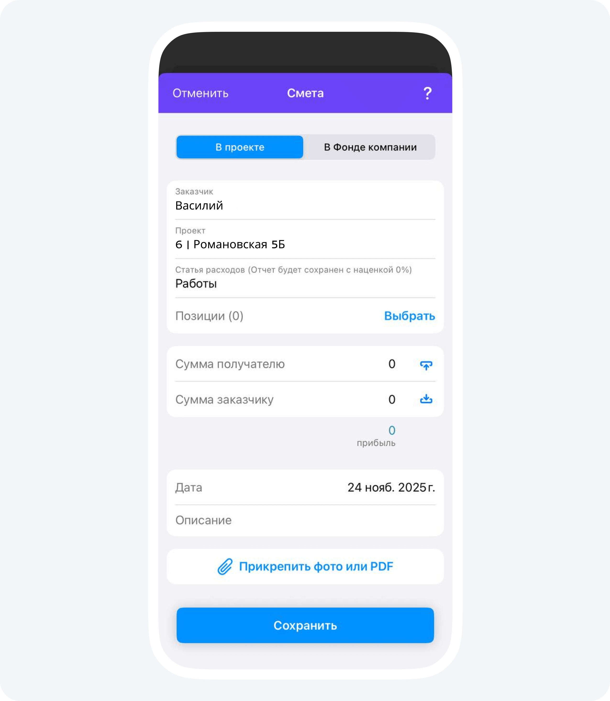 1. Нажмите на «+» в нижней части экрана и выберите опцию «Смета»