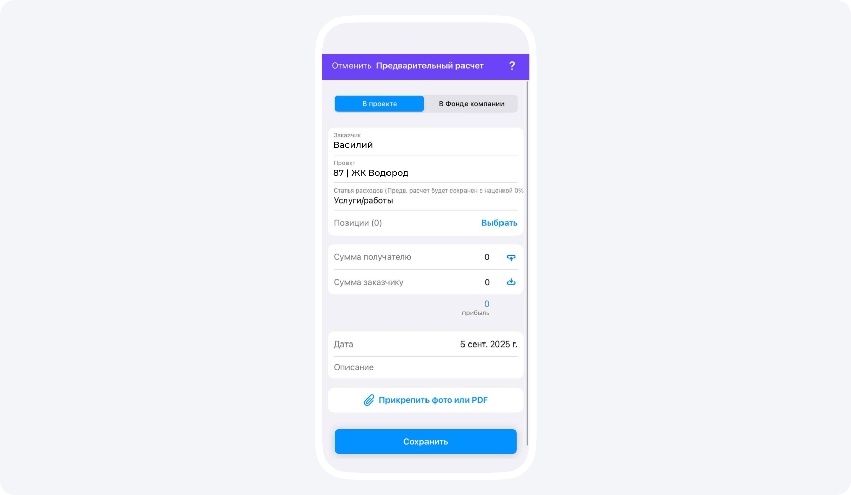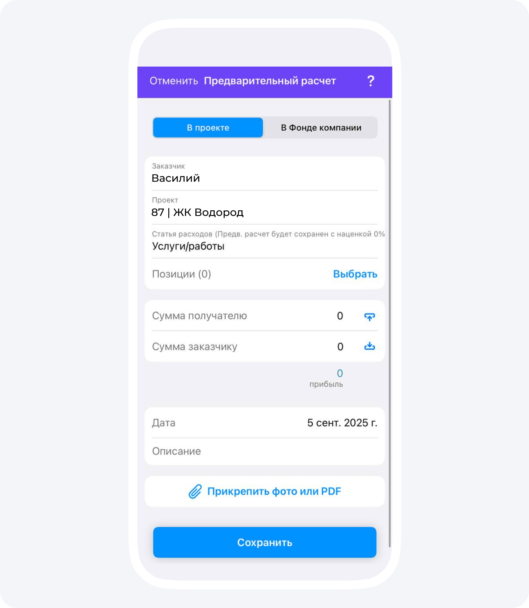 1. Нажмите на плюсик в нижней части экрана и выберите опцию «Предварительный расчет»