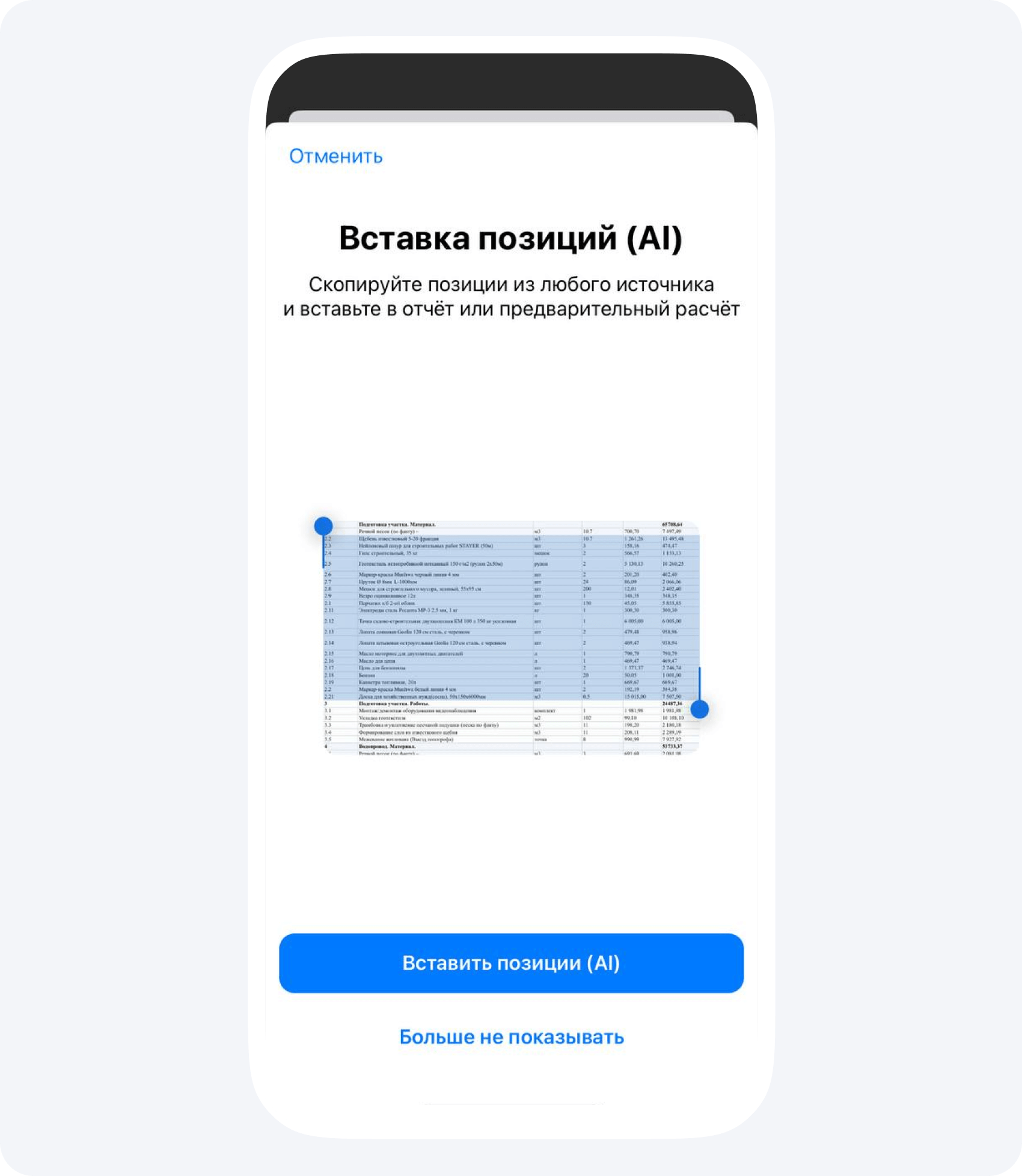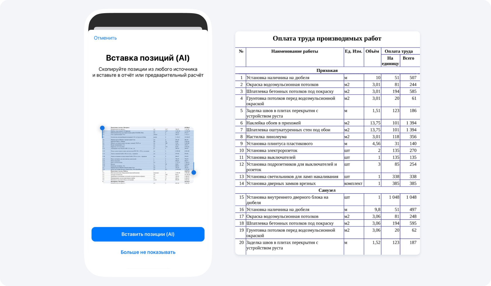 Теперь в Приложение 101 можно быстро импортировать любую смету, которую вы создали в Excel или любом другом редакторе. Это легко сделать с помощью встроенного ИИ: