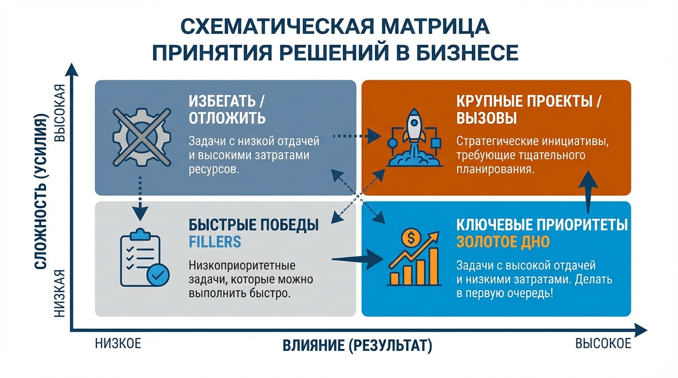 Матрица не должна становиться отдельным проектом. Её задача — помочь принять решение в рамках текущей работы. Ниже схема, которая даёт результат без лишних движений.