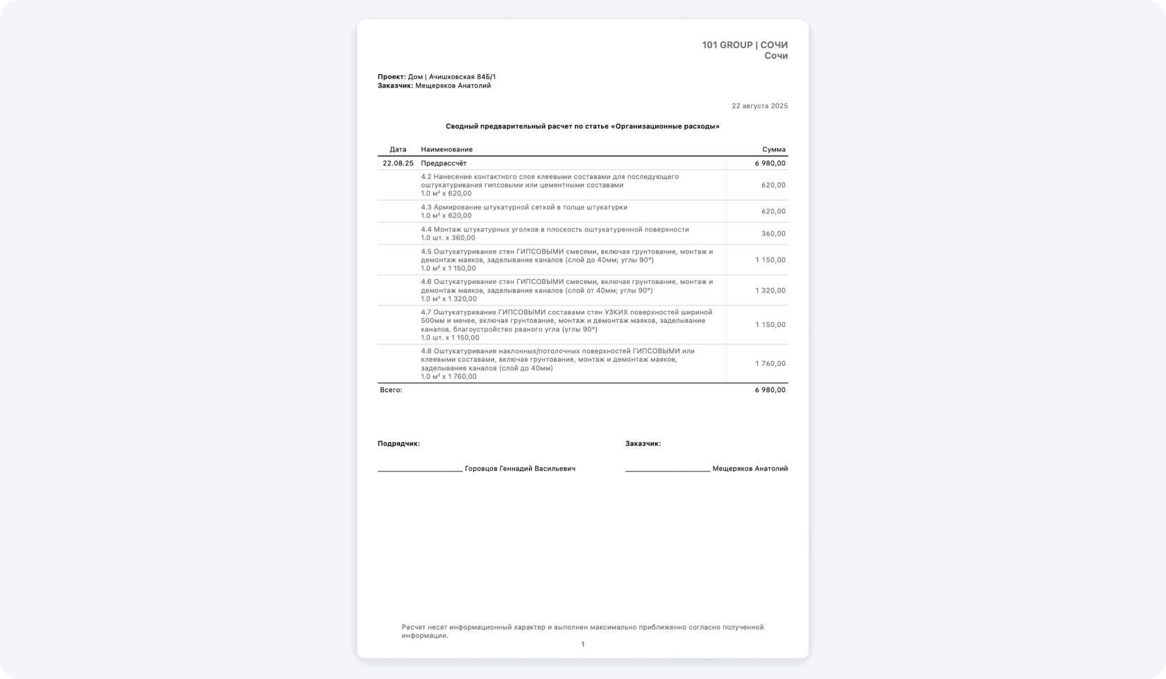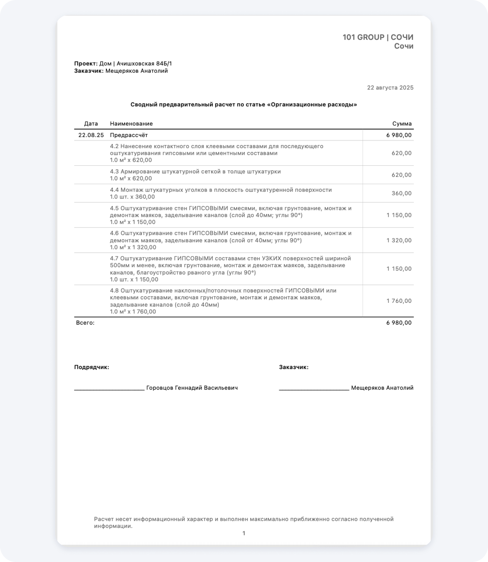 Смета в PDF из Приложения 101 сохраняет структуру проекта: разделы, статьи расходов, цены и итоги. Такой документ можно: