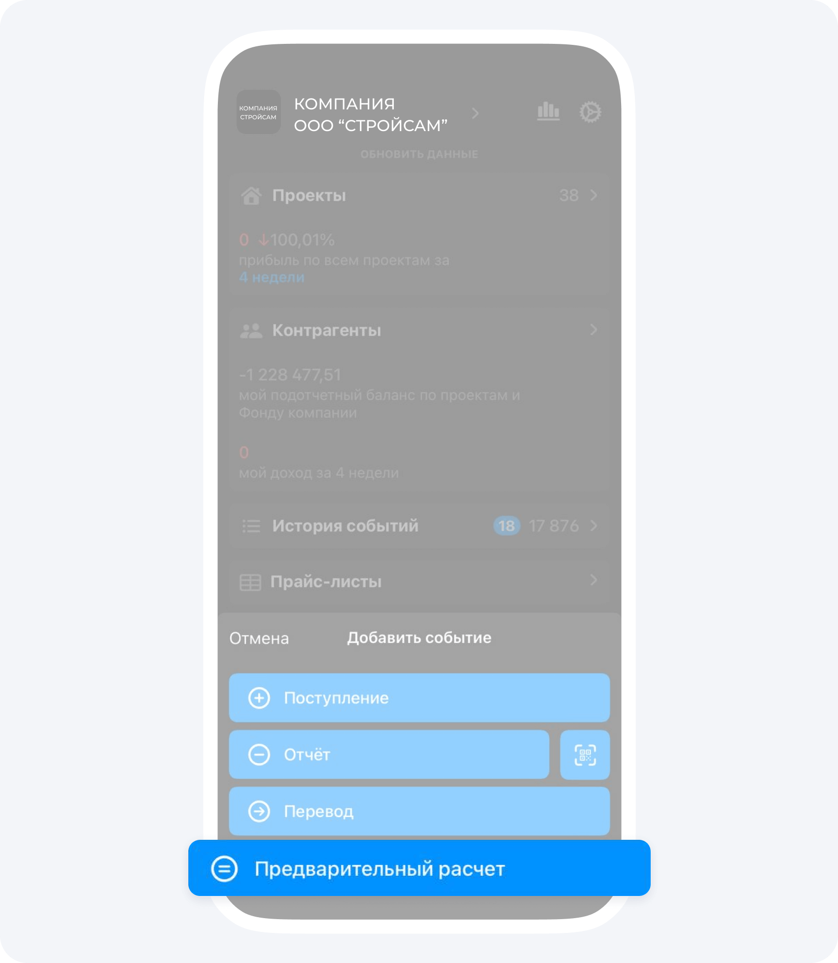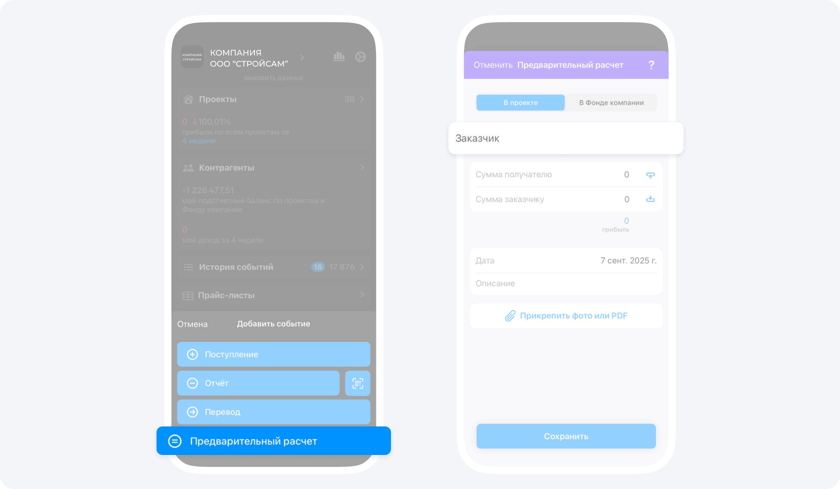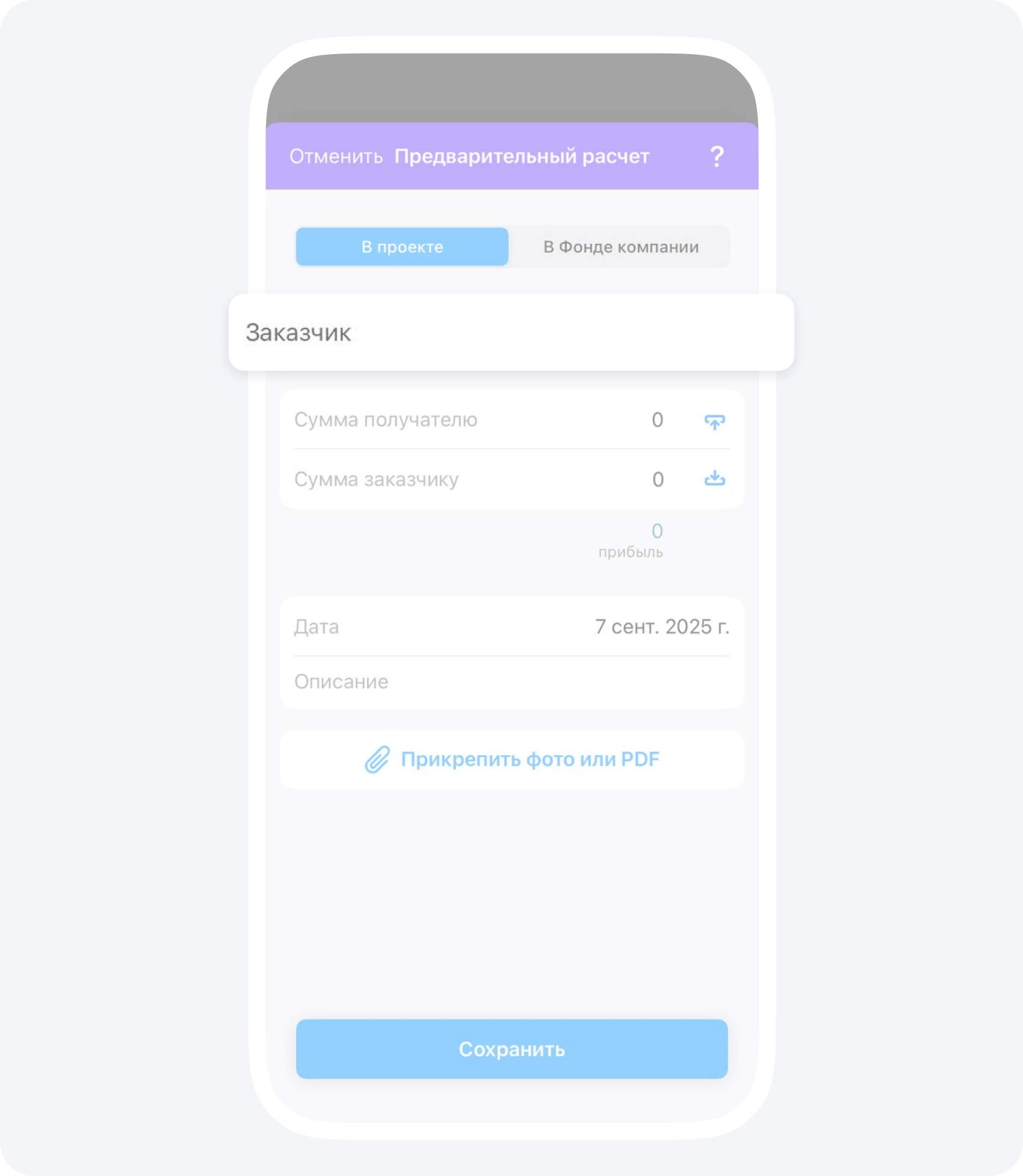 3. Нажмите на кнопку с + в правом нижнем углу экрана, выберите пункт Предварительный расчет. Выберите проект, заказчика и статью расходов.