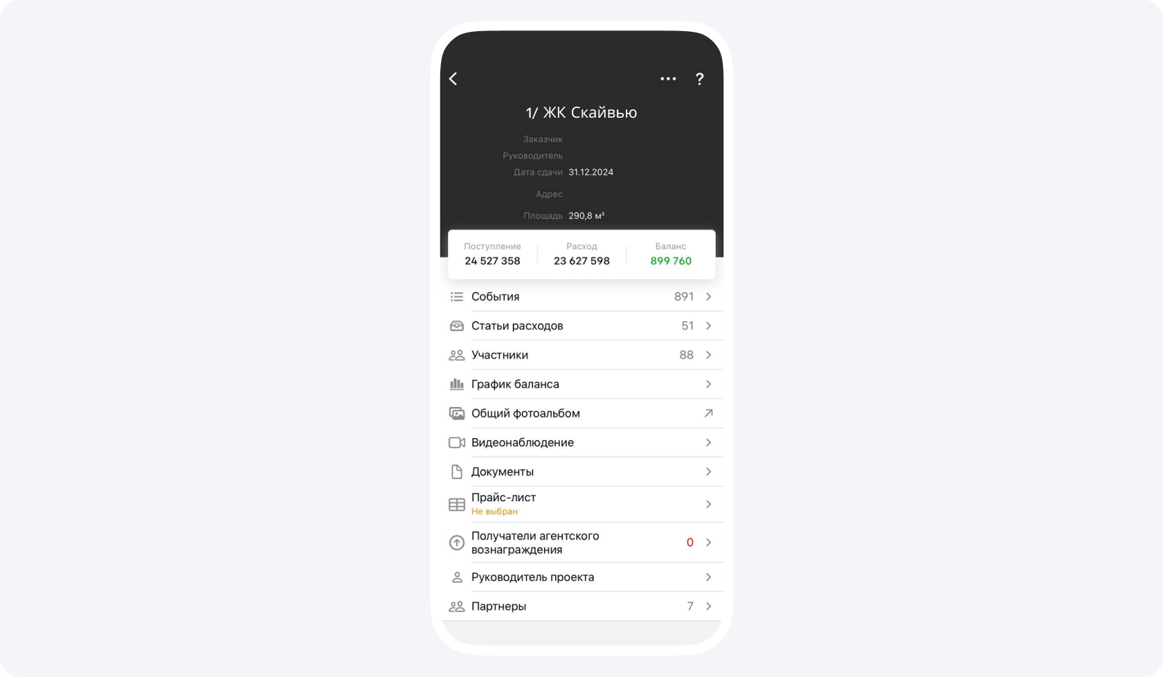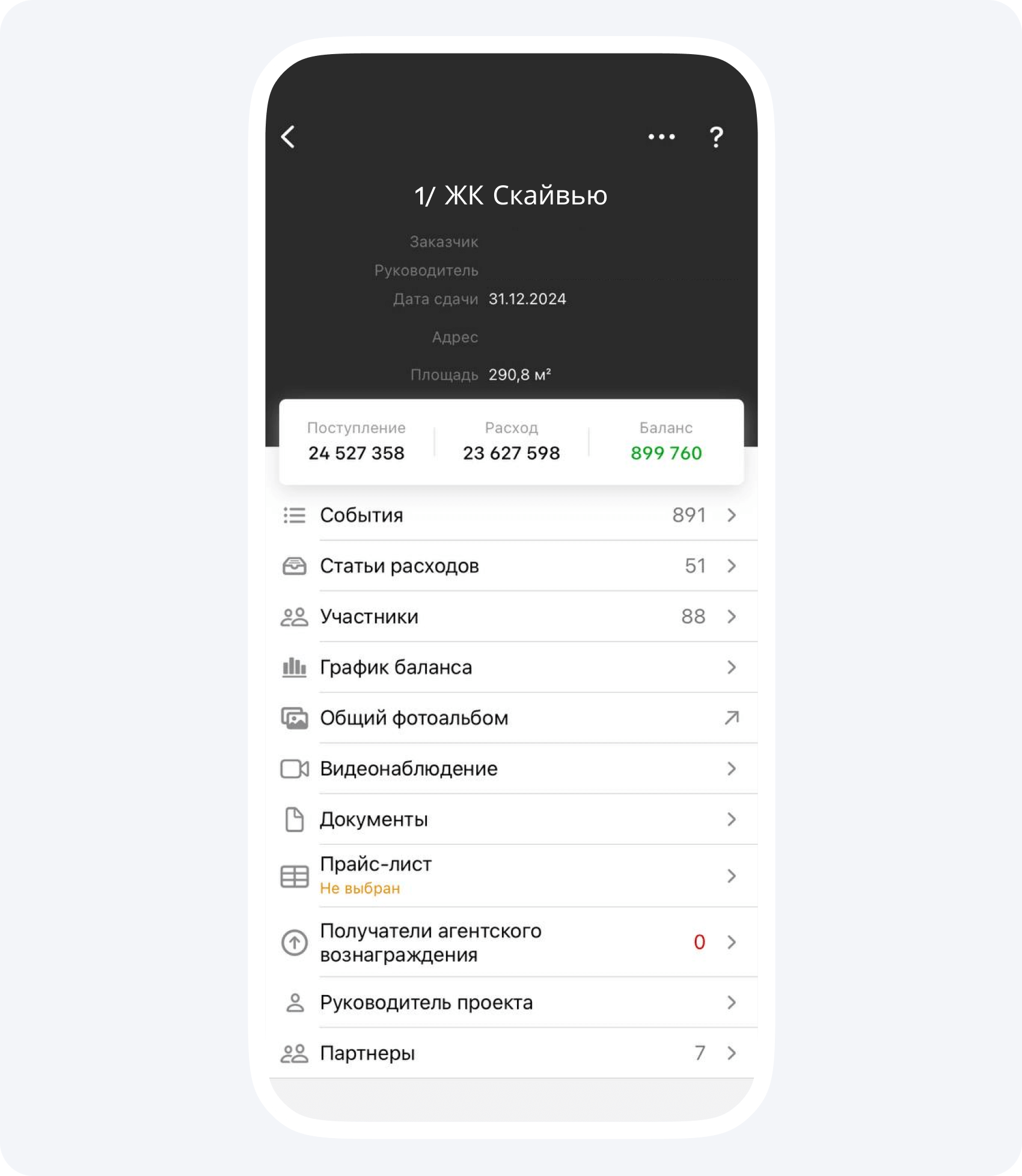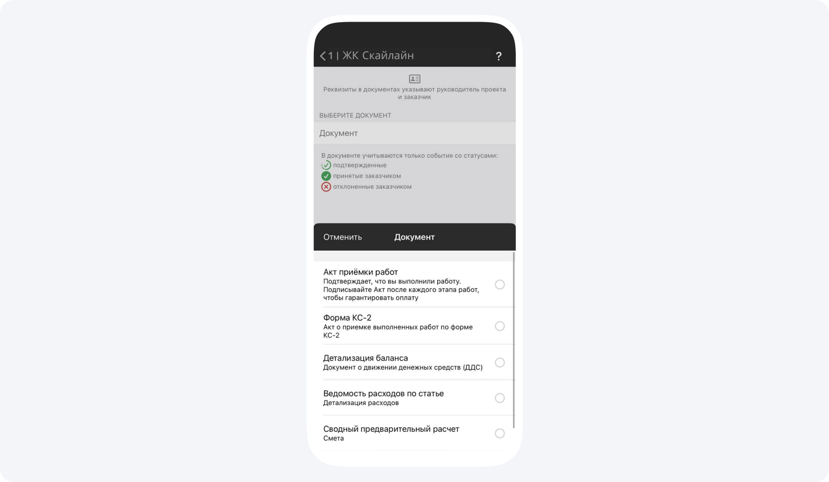 3. Нажмите на кнопку с + в правом нижнем углу экрана, выберите пункт Предварительный расчет. Выберите проект, заказчика и статью расходов.