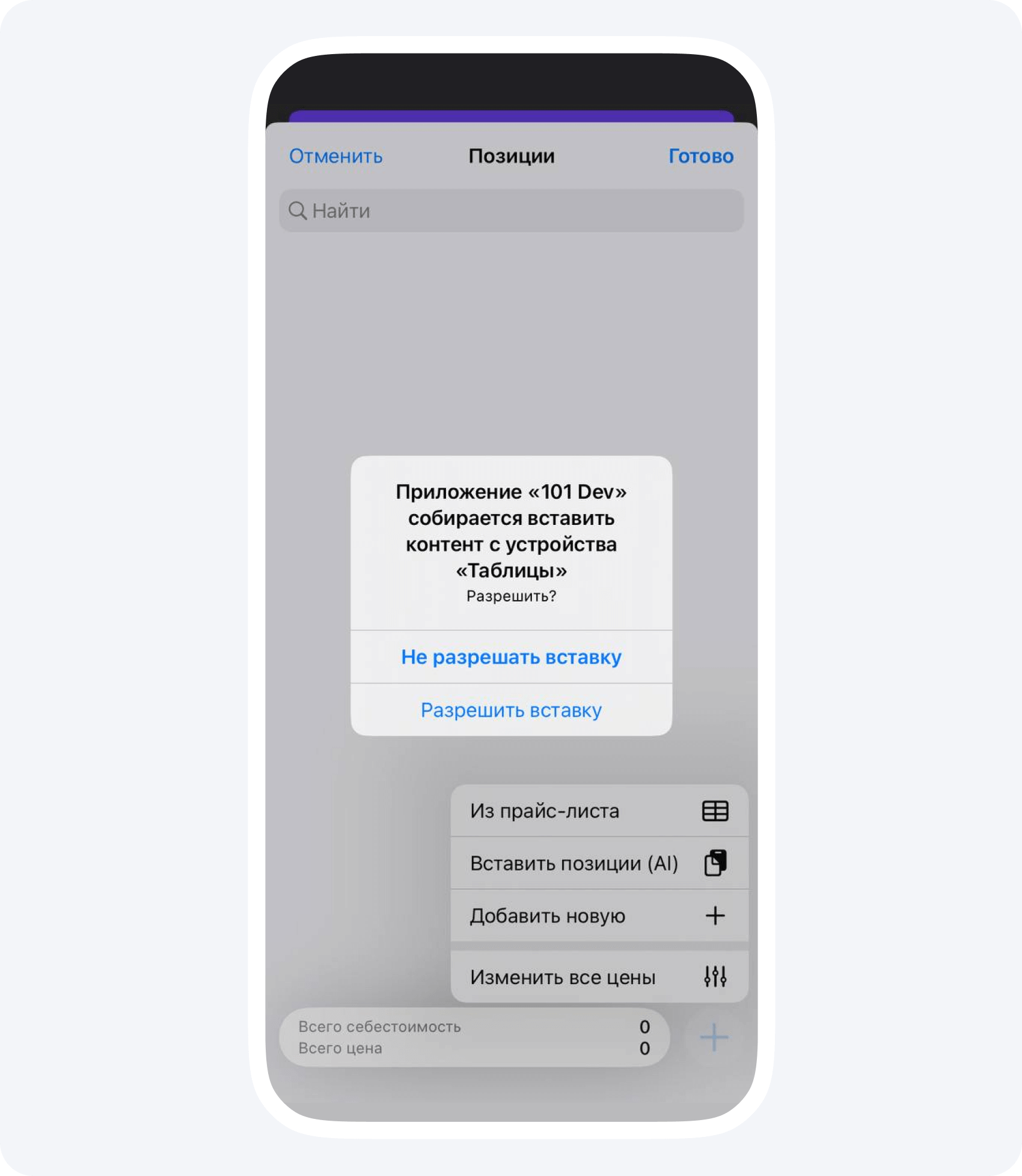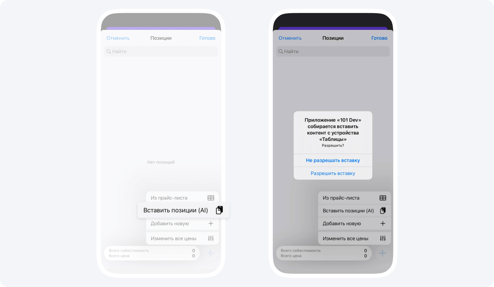 5. Нажмите на пункт Позиции, в правом нижнем углу, тапнув на +, вы сможете выбрать пункт Вставить позицию (AI).