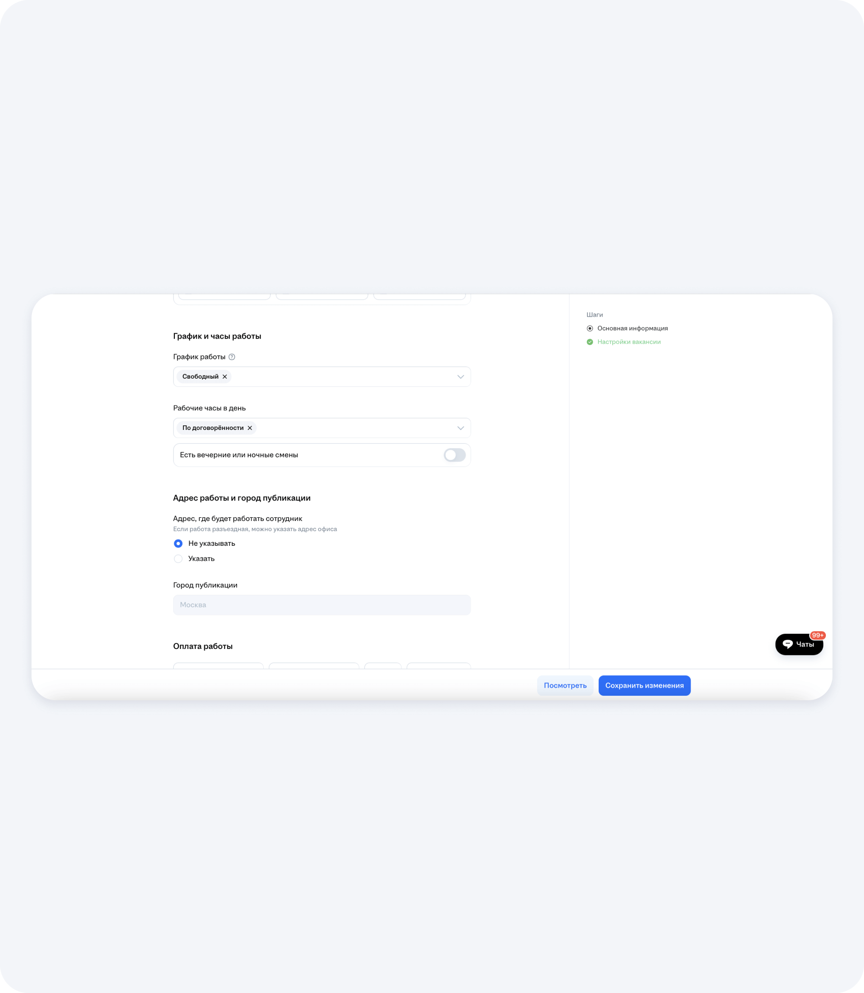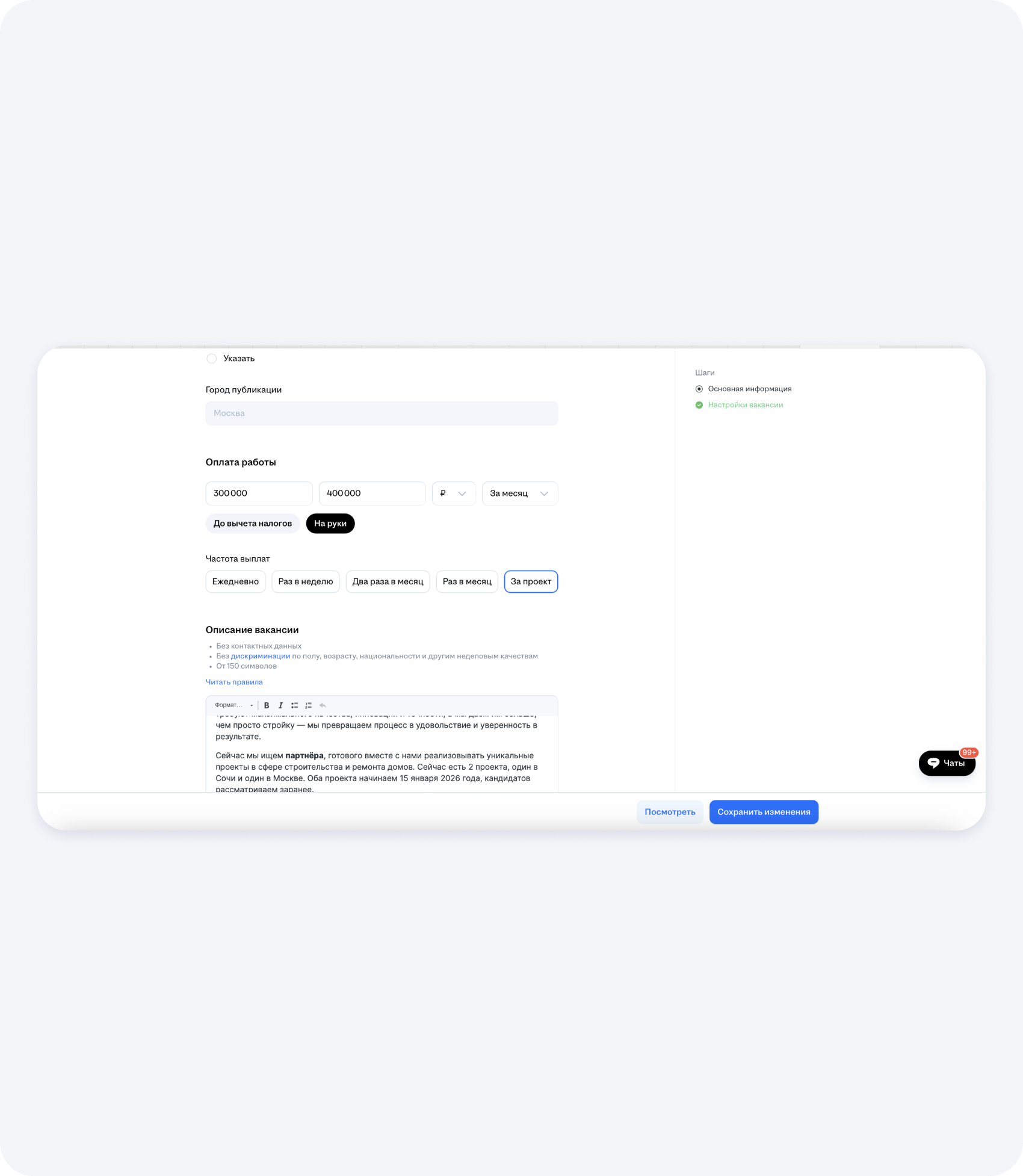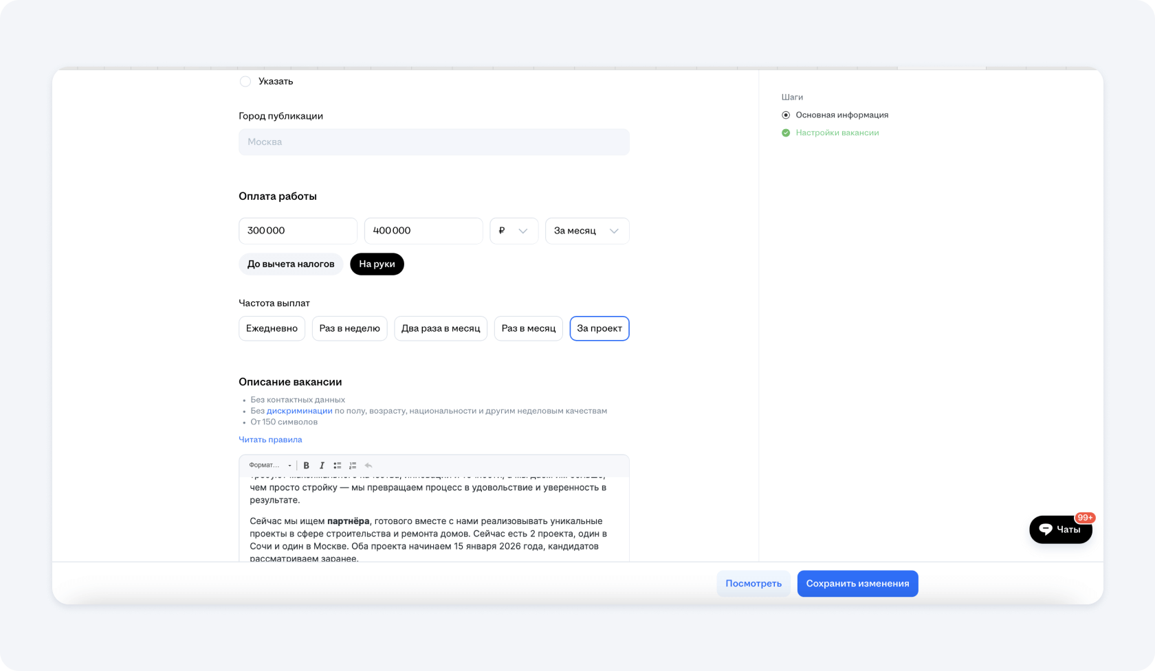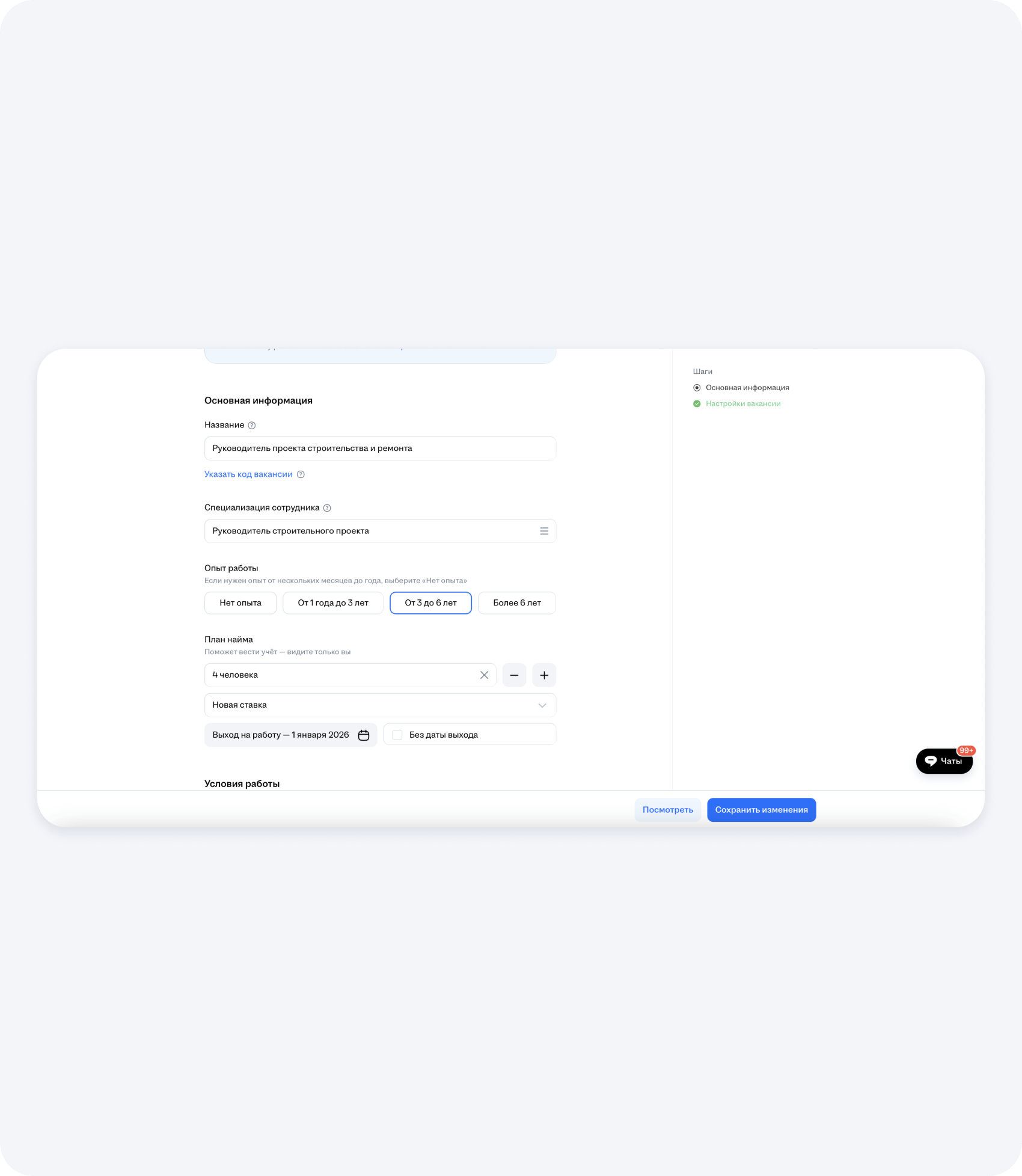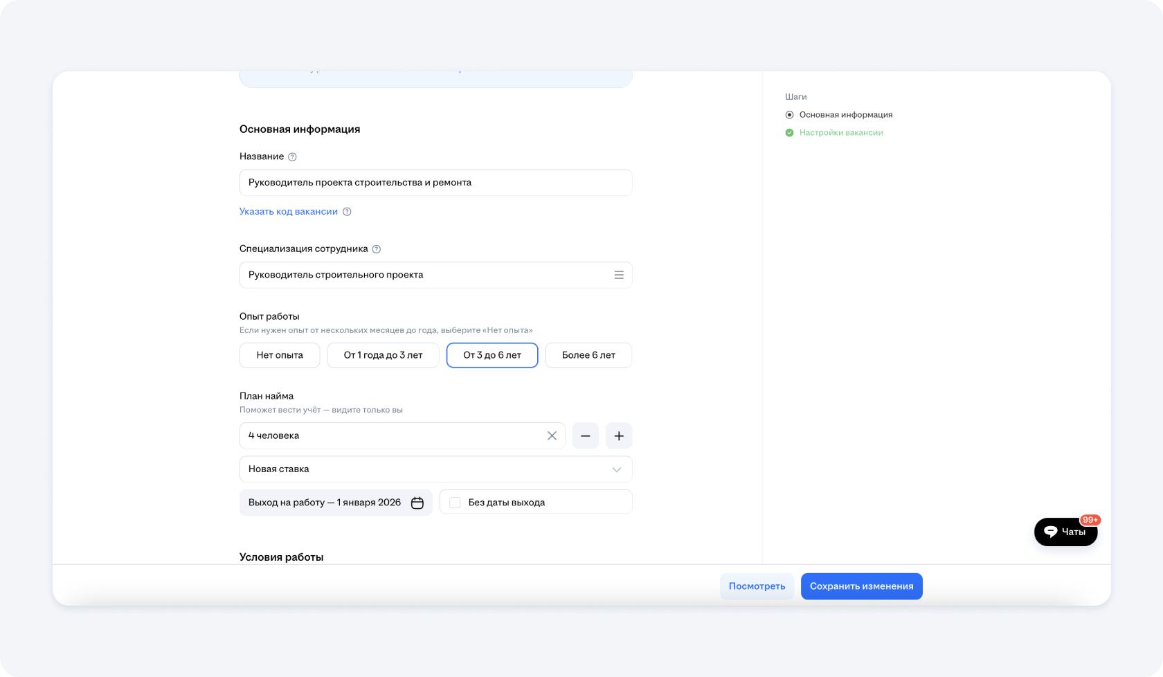 Чтобы разместить вакансию по поиску прораба на hh.ru, нужно грамотно заполнить все предлагаемые платформой поля. Сделаем это пошагово: