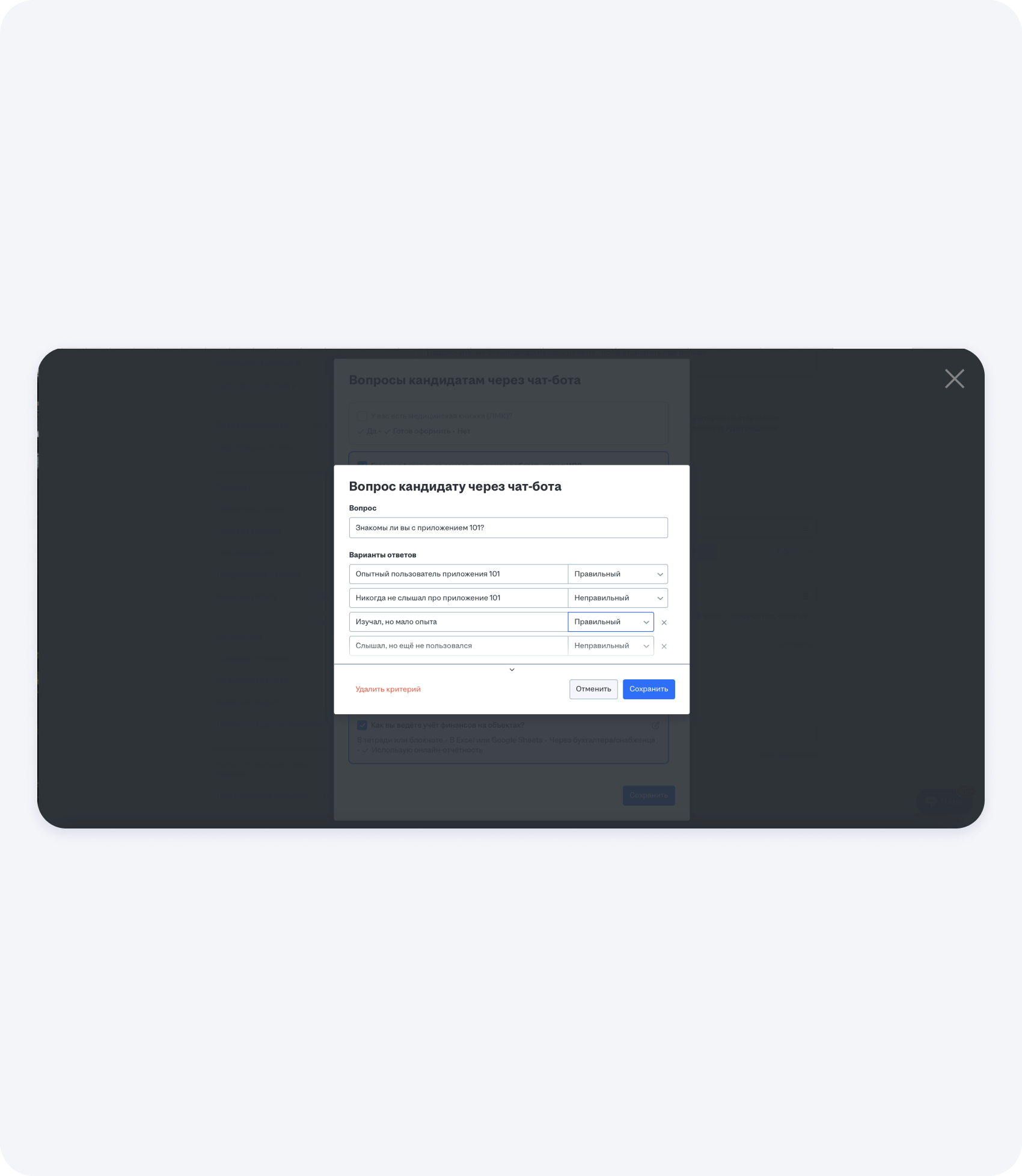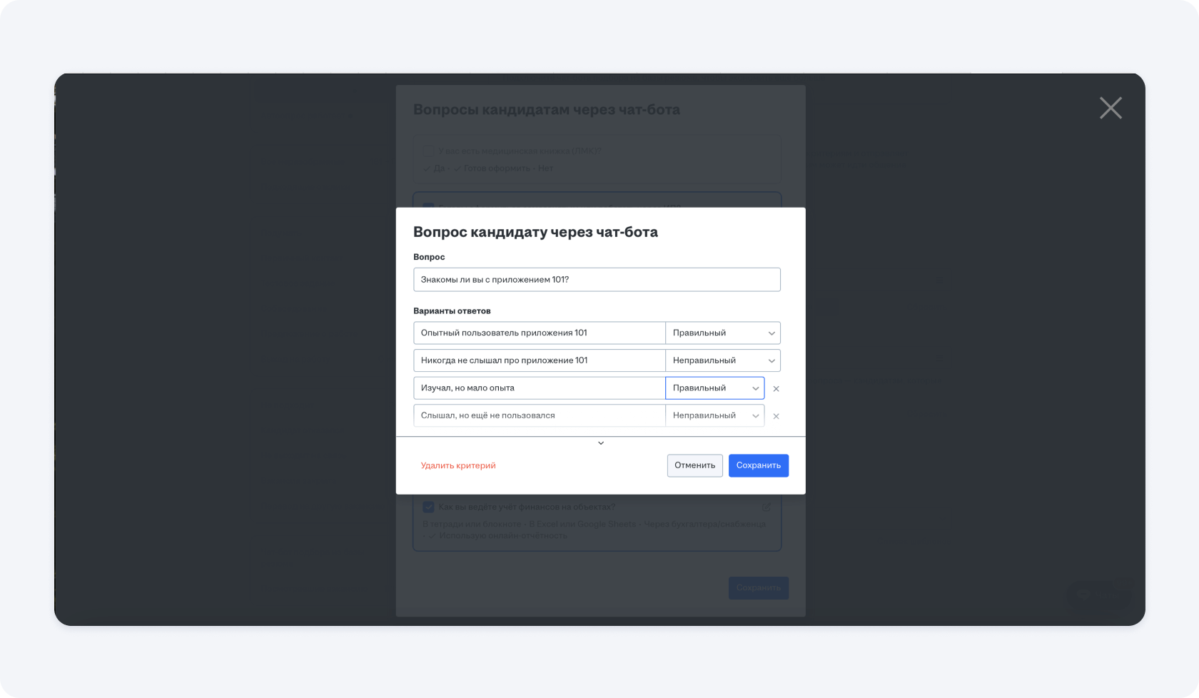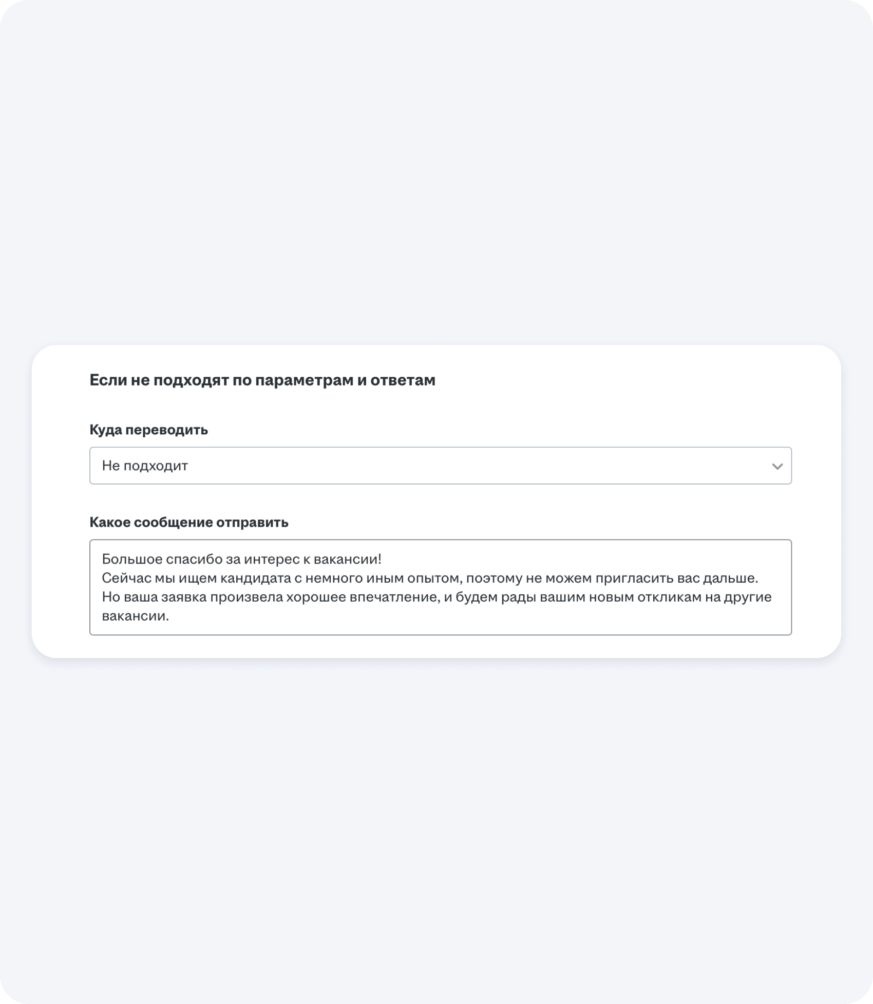 Ответы на эти вопросы нужно заранее прописать и отметить, какие из них пропускают соискателя дальше, чтобы его кандидатуру рассмотрел руководитель. Например, если человек не готов к официальному оформлению, то робот автоматически отправит ему сообщение о том, что он не подходит.