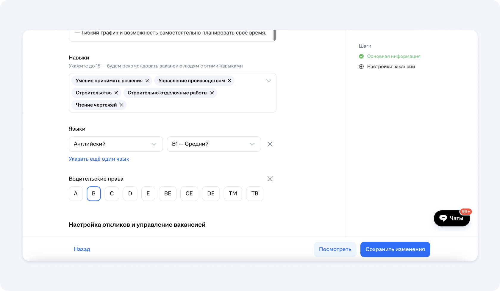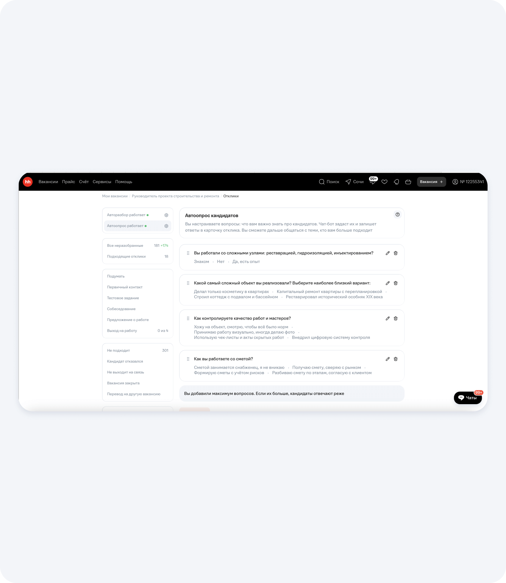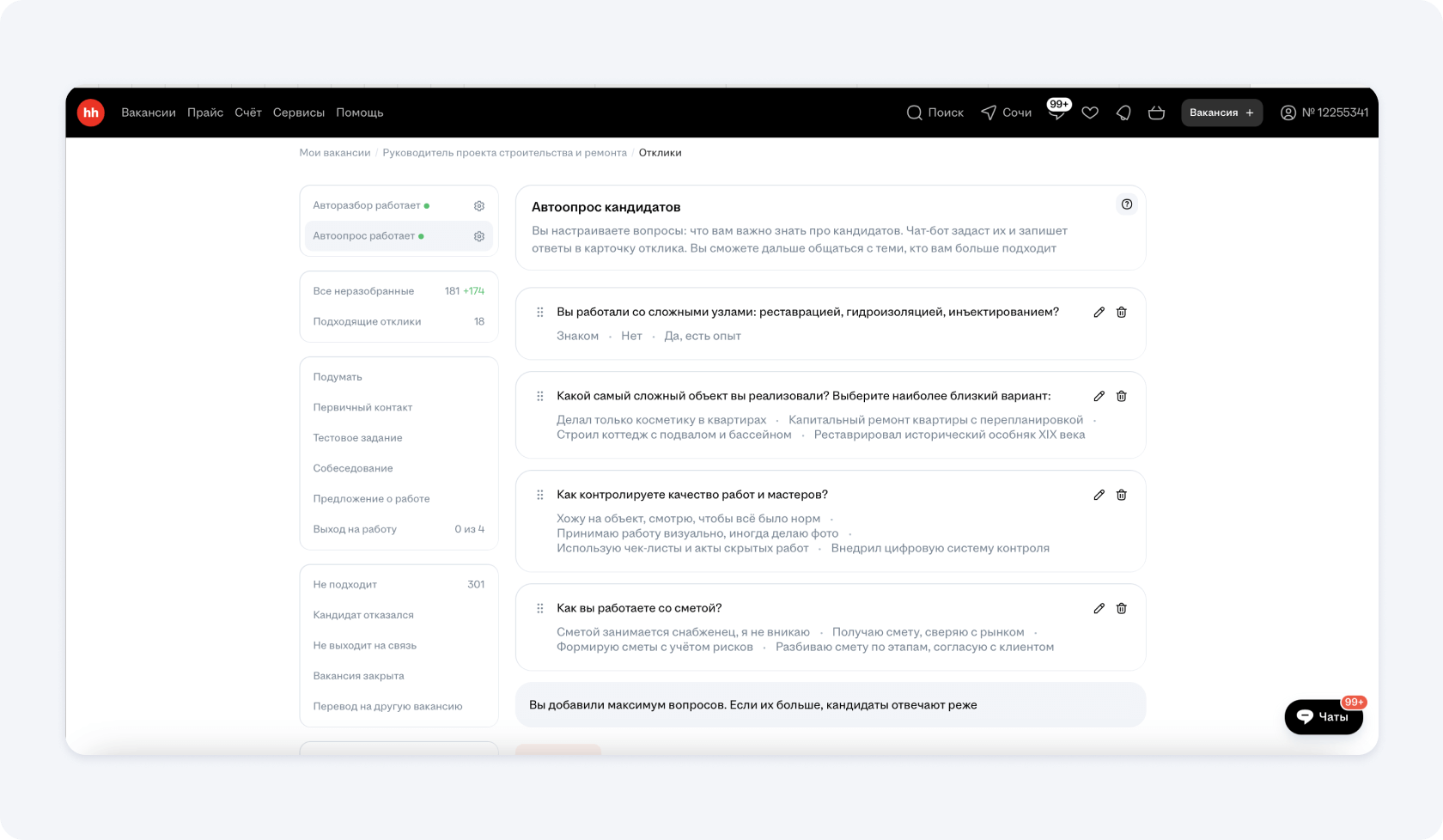 9. Настройка откликов и управление вакансией прораба