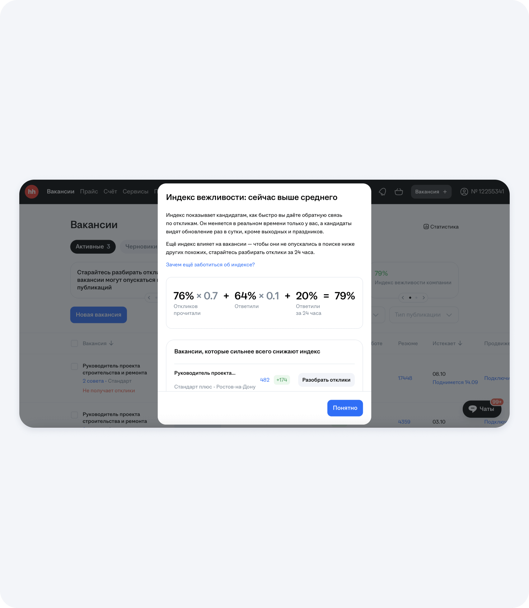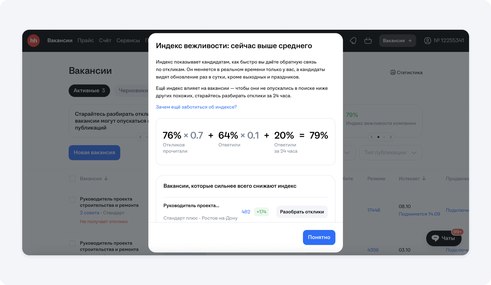 - Автоответы. Это самый главный пункт по продвижению вакансии. Самостоятельно бывает трудно оперативно разобрать все ответы, особенно если вы ищете сотрудников в большом городе. А если неактивно отвечать, то ваш ваш индекс вежливости будет понижаться и вакансия будет показываться меньшему количеству людей.
