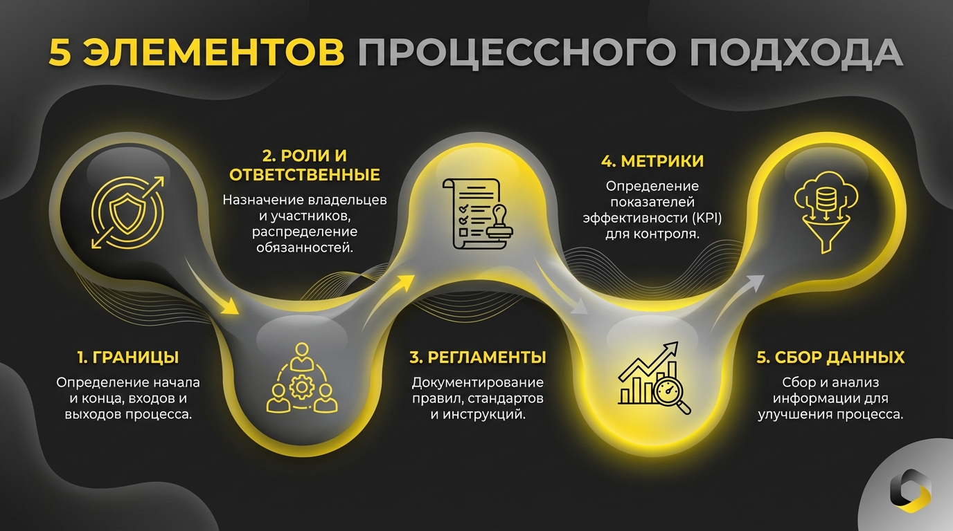 Система процессного подхода строится из нескольких «деталей». Без них процессный подход остаётся словом в презентации.