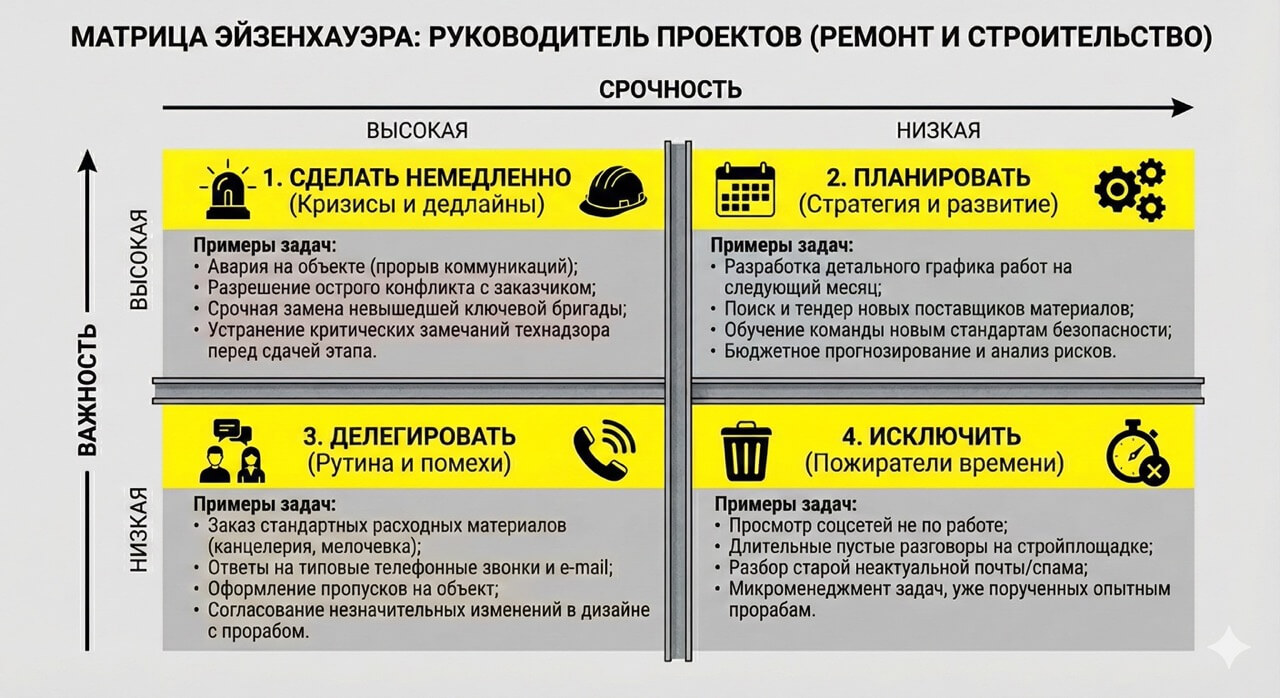 Когда на вас с утра льется поток задач, научитесь распределять их по этому принципу. Например, вам предстоит доставить на объект стройматериалы, найти нового маляра, запросить у заказчика аванс. Первое — это что-то безусловно срочное, но такое ли важное, что за это должен браться руководитель? Возможно, это можно делегировать, но системно, а, значит, надо решить, обращаться ли в компанию-перевозчика, нанимать сотрудника с газелью на зарплату или кому-то из мастеров предложить подработку. Эти вопросы приведут к созданию новой не срочной, но важной задачи — решение проблем с доставкой стройматериалов. Еще больше примеров задач в таблице ниже: