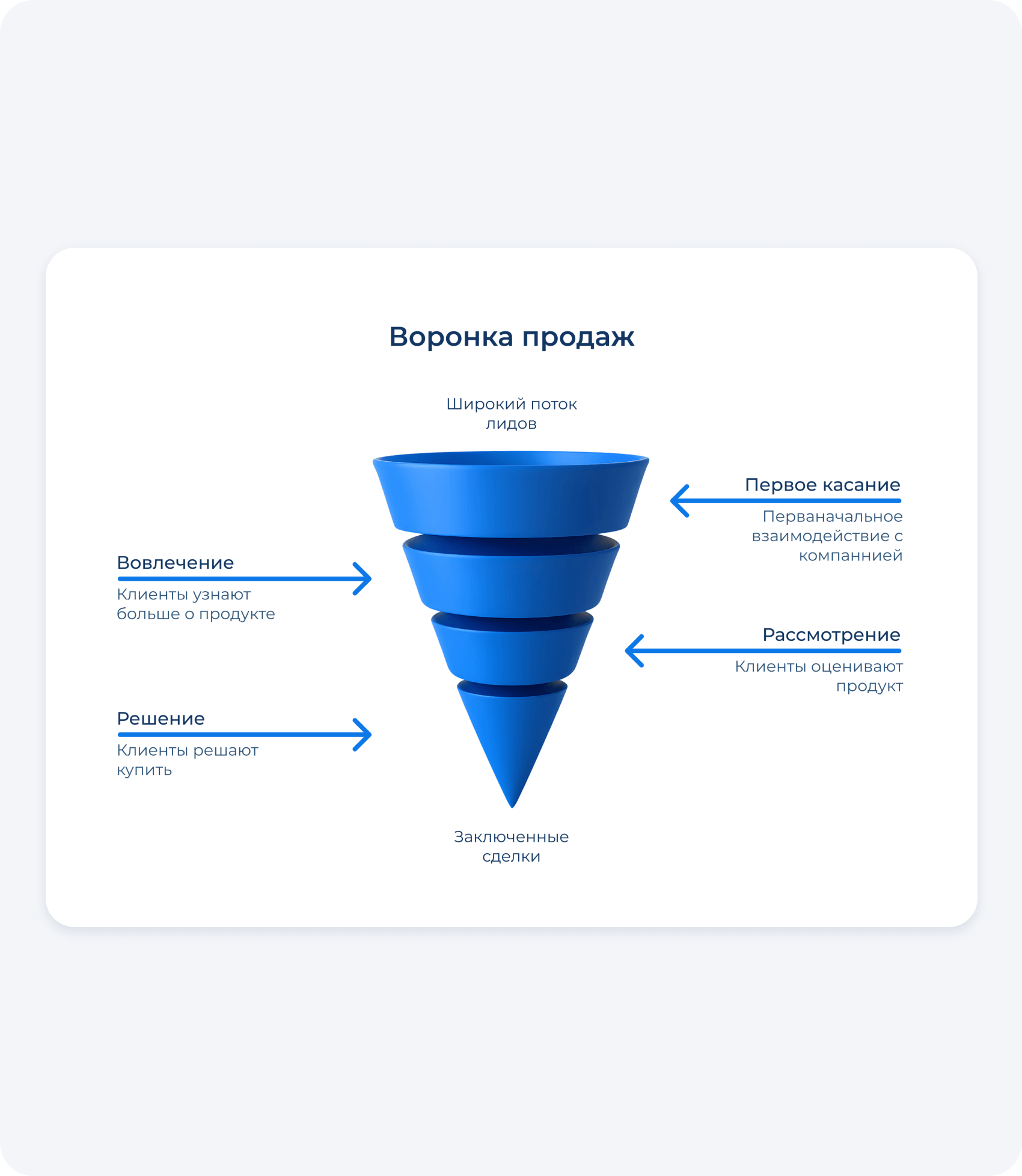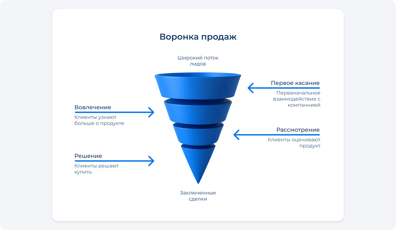 Воронка продаж — это схема, описывающая различные этапы взаимодействия клиента с компанией: от первого касания (например, сообщение в мессенджере или переход на сайт с рекламы) до заключения сделки.