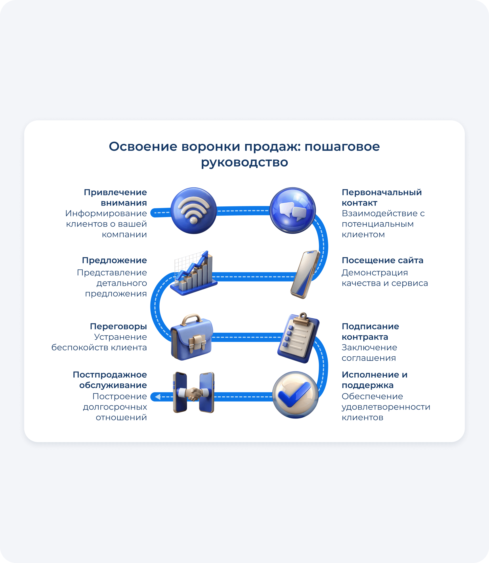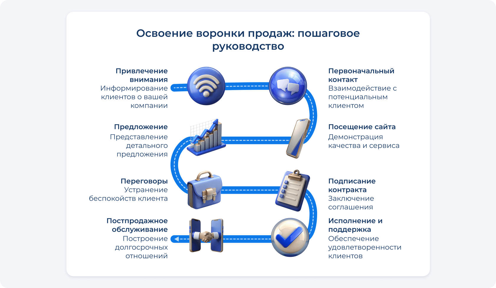 Каждая воронка делится на этапы. Ниже мы приведем пример, который можно взять за основу для создания собственной воронки: