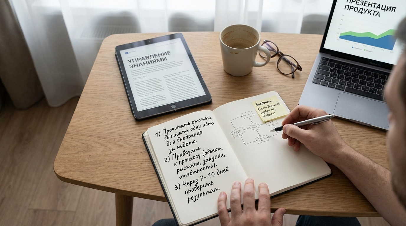 2) Сразу привяжи мысль к конкретному месту в процессах: объект, статья расходов, правило закупок, ритм отчётности, созвон по цифрам. Чем ближе к факту, тем выше шанс, что идея приживётся.