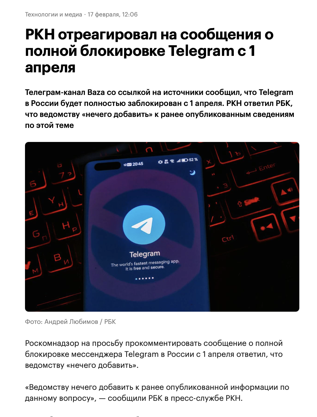 Факт № 2: до слухов про 1 апреля уже шли ограничения. 10 февраля 2026 года СМИ со ссылкой на пресс-службу сообщали, что РКН продолжит «последовательно ограничивать» работу Telegram, пока не будут устранены нарушения.