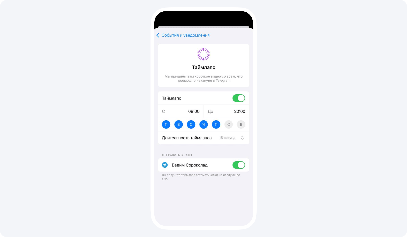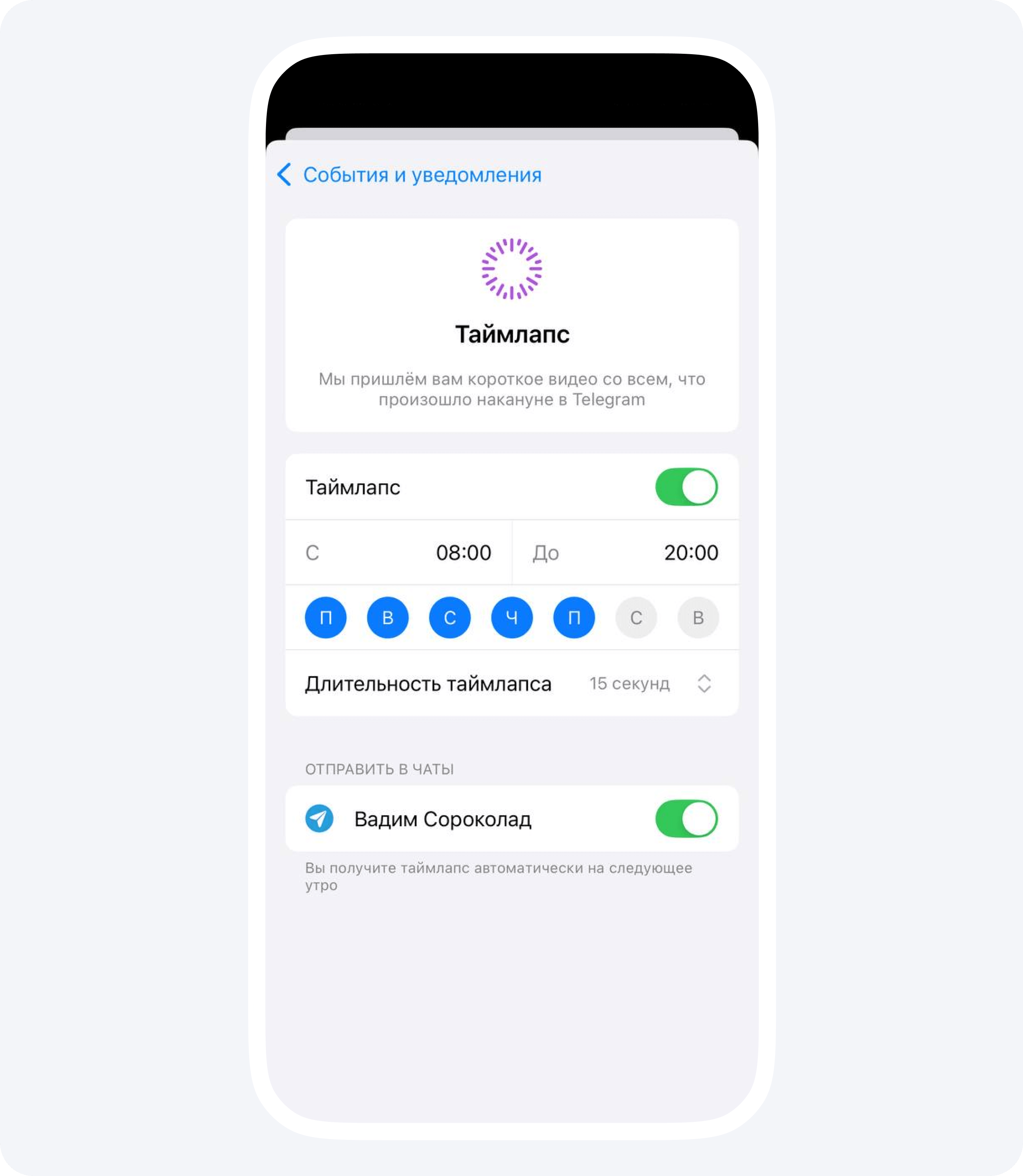 4. Выбрать в основном меню функцию таймлапса, определить, в какие дни нужно отправлять вам таймплас, и ожидать готовое видео в формате GIF в Telegram.