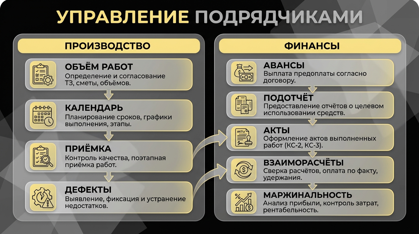 Удобно делить управление подрядчиками на две части. Первая — производственная: объём работ, календарь, приёмка, дефекты. Вторая — финансовая: авансы, подотчёт, акты, взаиморасчёты, маржинальность.