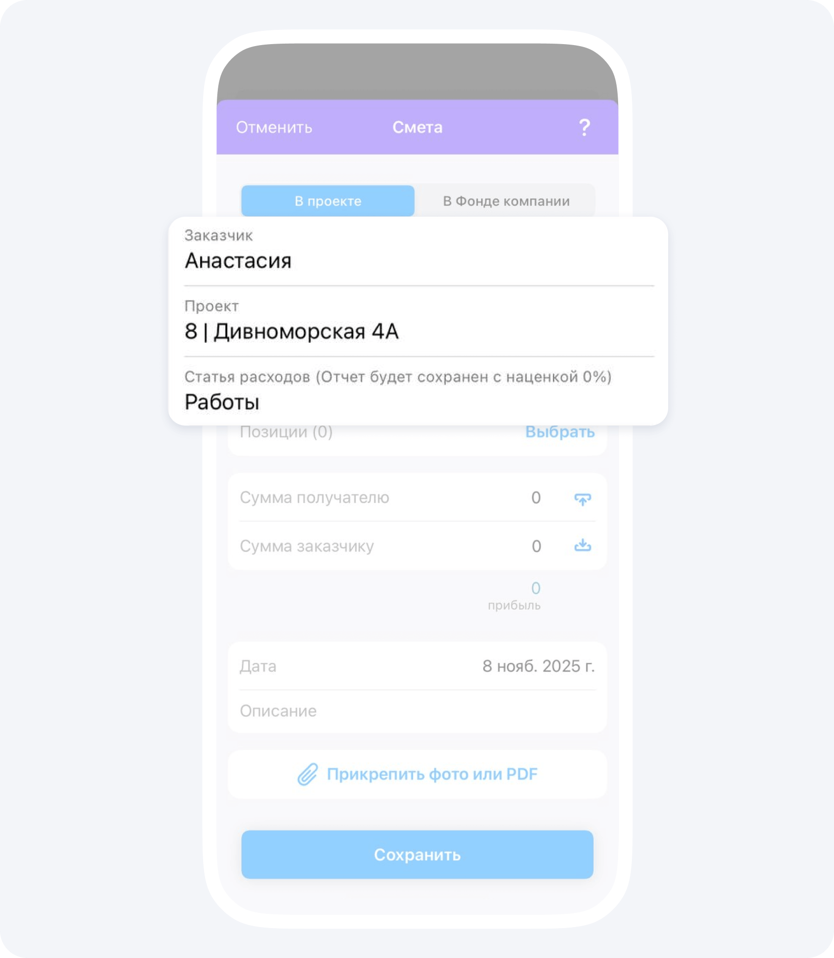 5. После сохранения смета будет отправлена на рассмотрение руководителю проекта.