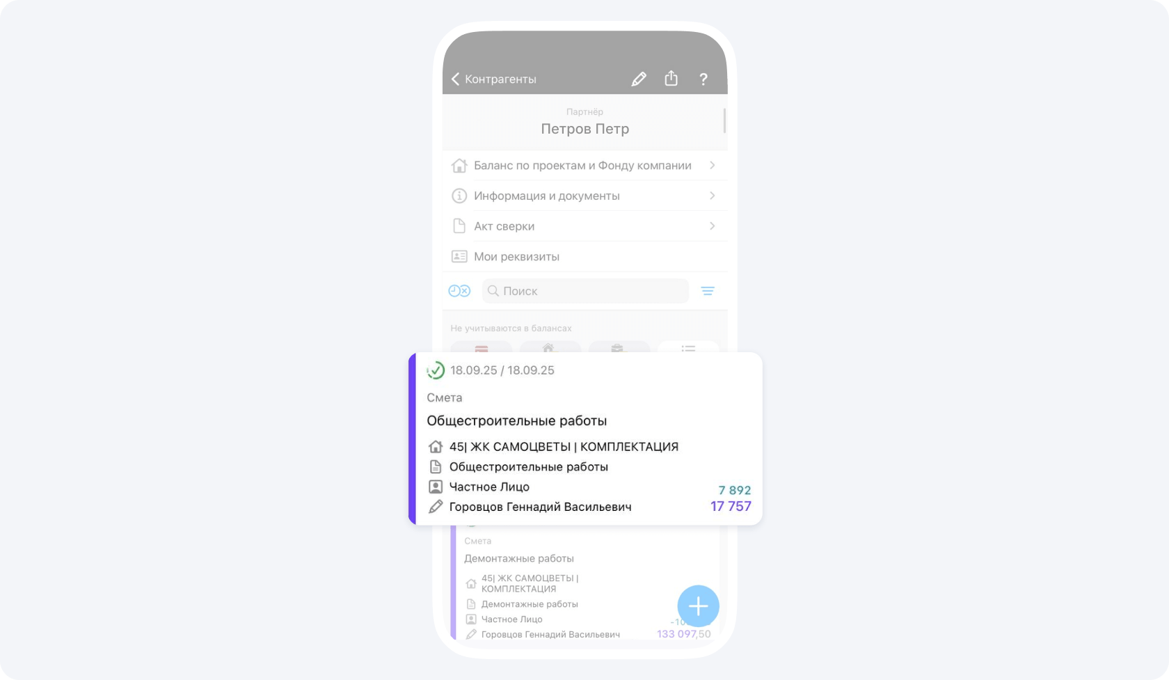 - найдите нужного Заказчика из списка контрагентов. Если у заказчика несколько проектов, выберите необходимый проект;