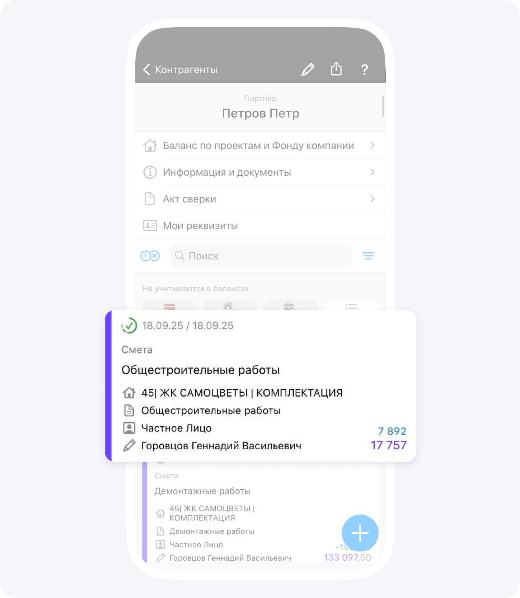 1. На Главном экране приложения нажмите синюю кнопку с «+» и выберите событие Смета.