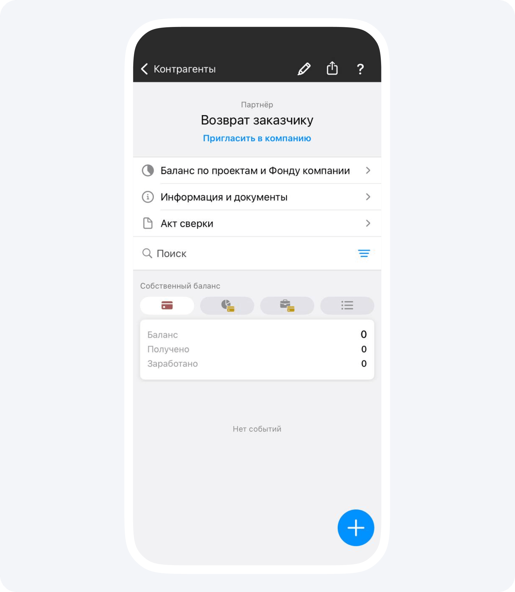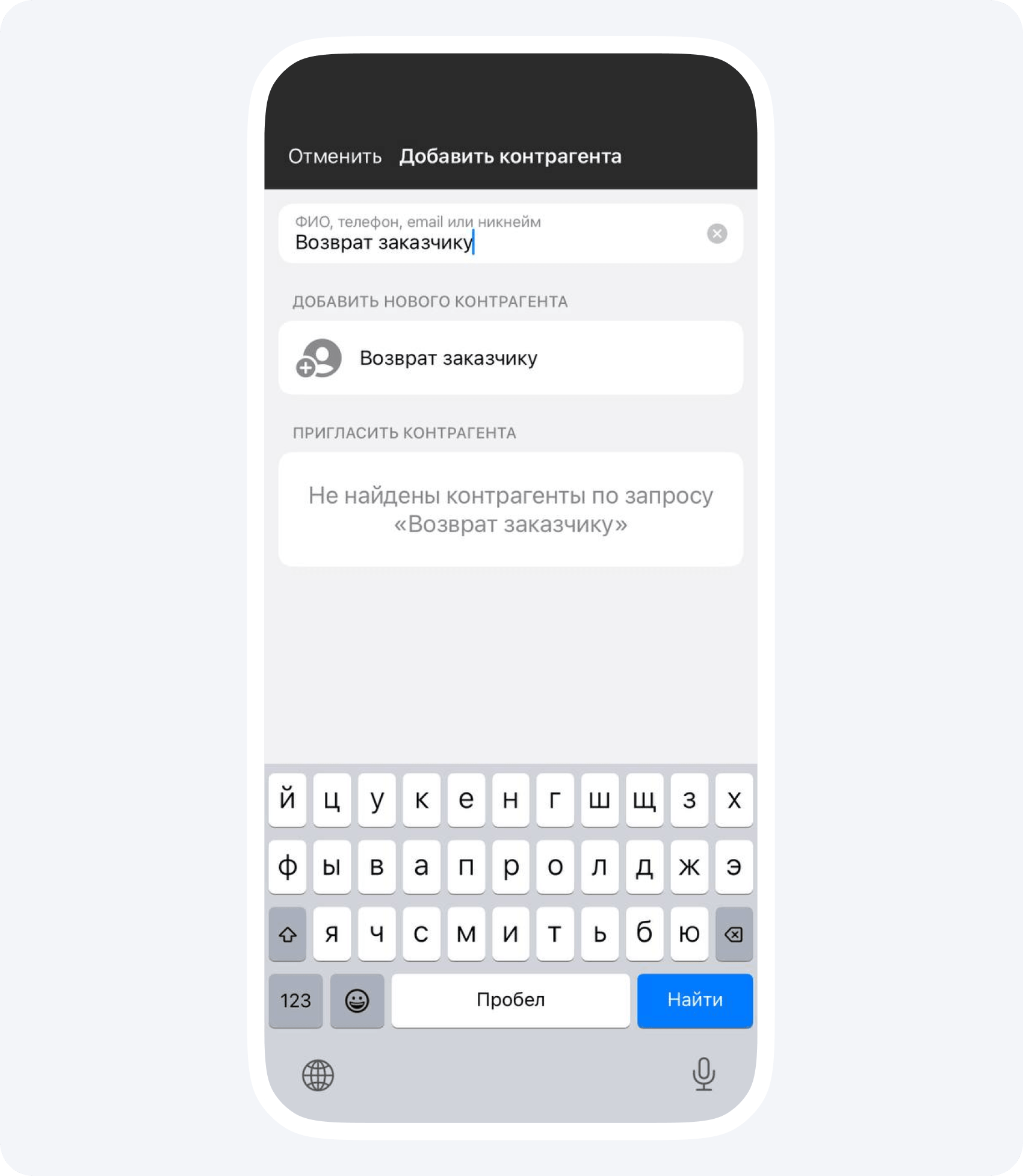 1. Создайте контрагента и назовите его «Возврат заказчику». Его вы сможете использовать для внутренней бухгалтерии на разных проектах.