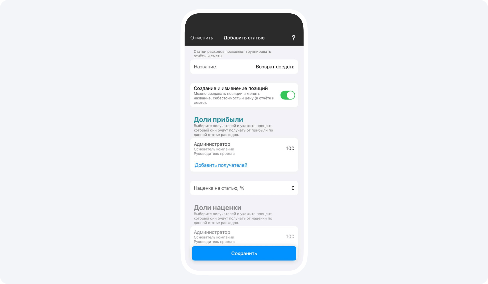 2. Добавьте в проект новую статью расходов и назовите ее «Возврат средств» (получателем укажите компанию или любого другого контрагента, потому что это никак не повлияет на балансы). Наценку нужно оставить нулевой или выключить ее.