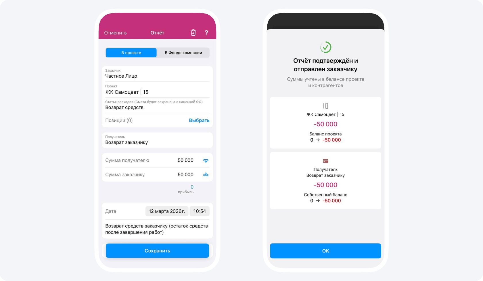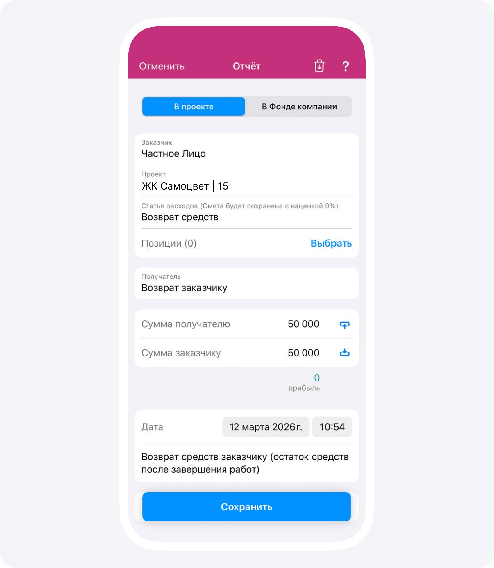 Получателем в нем укажите контрагента «Возврат заказчику», а в качестве статьи расходов также выберите «Возврат средств». Сумма получателю и сумма заказчику должна быть одинаковой. В описании обозначьте, что это возврат средств + опишите причину (остаток средств после выполнения работ, например).