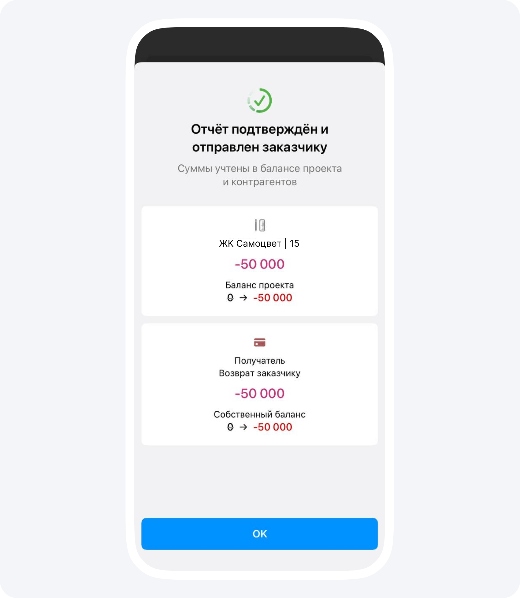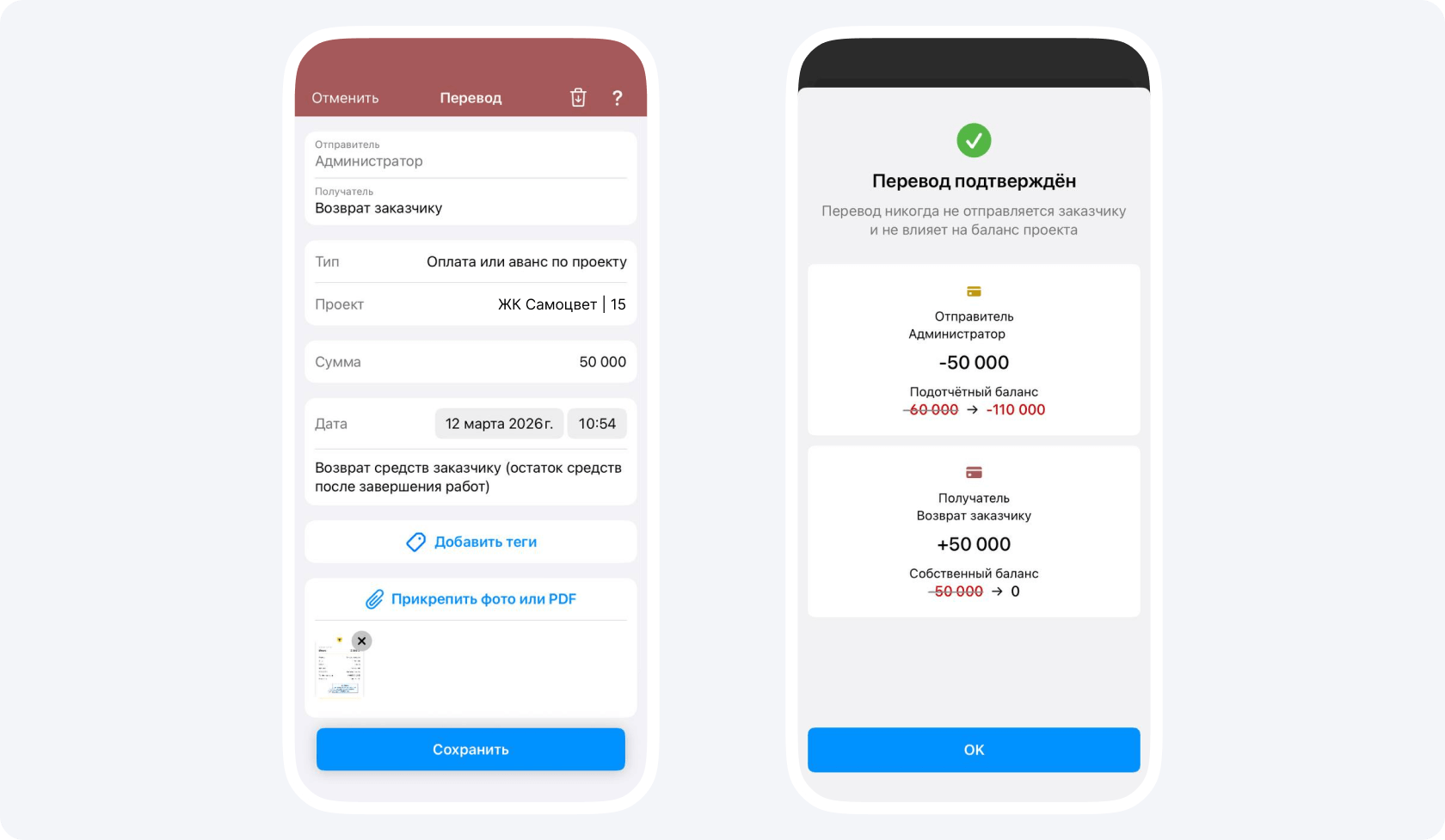 Не забудьте прикрепить к этому отчету чек о переводе средств или платежное поручение. Затем подтвердите событие, чтобы балансы изменились.