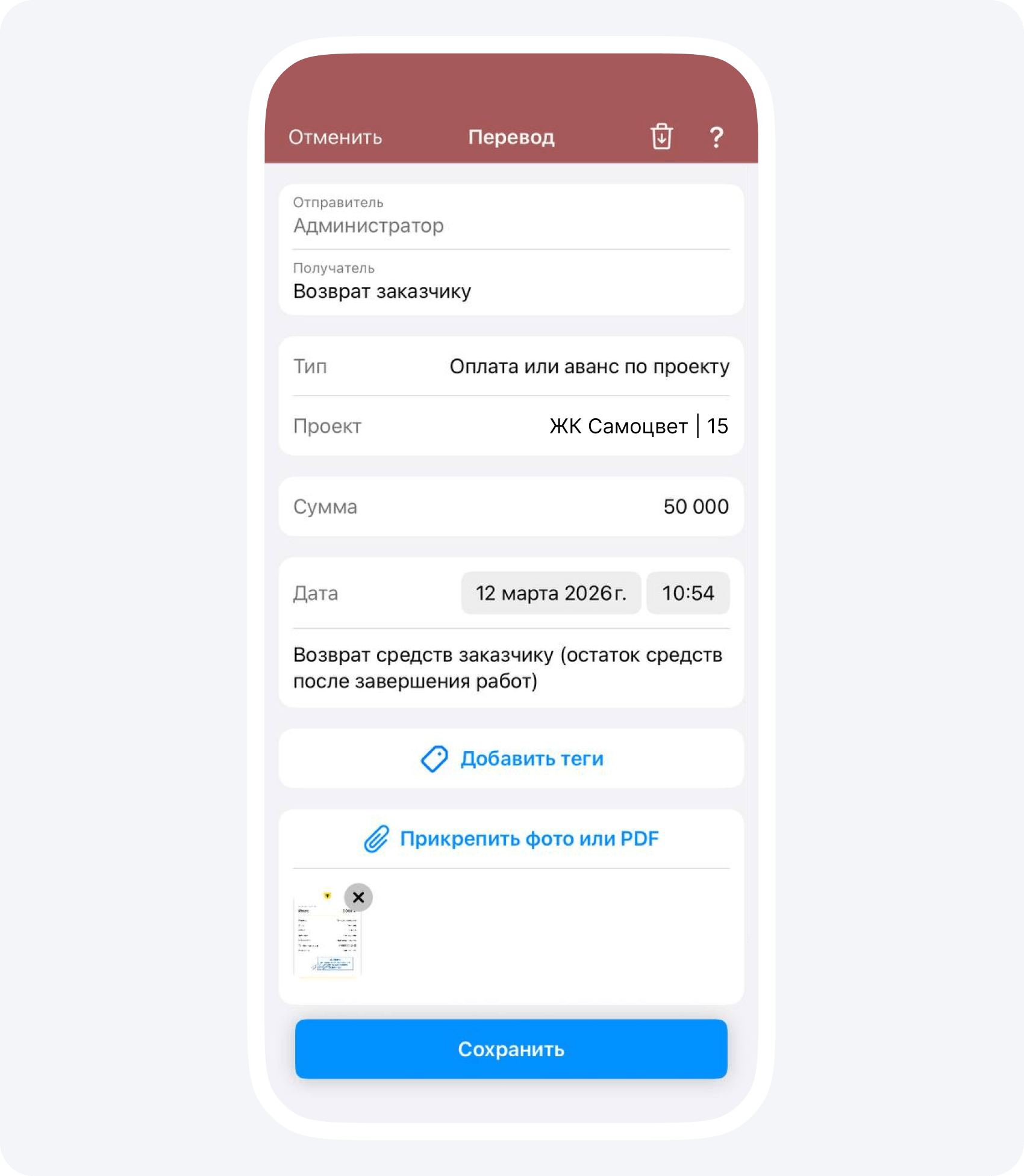 В описании события укажите, по какой причине вы делаете возврат, чтобы сохранить это в истории. Также прикрепите к событию платежное поручение или чек о переводе средств.